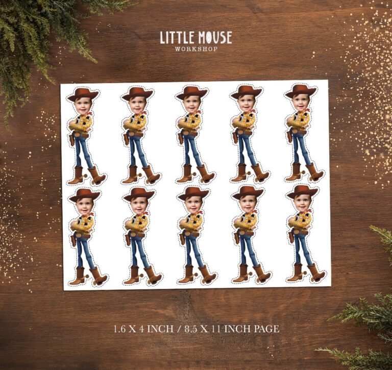 Transform your little sheriffs into the star of the show with these highly detailed custom face cowboy cupcake toppers, perfect for a Western or Woody-themed birthday bash. Featuring a classic yellow plaid shirt, cow-print vest, denim jeans, and spurred boots, this design captures the beloved spirit of the Wild West while showcasing your child's smiling face. Our design process ensures that the cartoon body’s skin tone is adjusted to match your uploaded photo for a seamless, professional look. These printable decorations measure approximately 1.6 by 4 inches, making them the ideal height for standard cupcakes or fun additions to a larger cake display. Simply print these digital files at home on cardstock, cut them out, and attach them to picks to create a memorable and hilarious dessert table centerpiece.