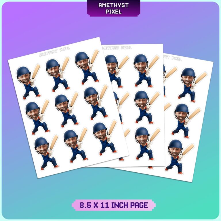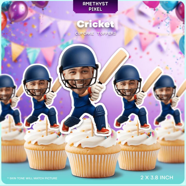 Hit a six at your next celebration by featuring the guest of honor right in the center of the action with these personalized cricket cupcake toppers. Ideal for sports-loving children, teens, and adult fans alike, this vibrant design showcases a dynamic batsman mid-swing, decked out in a professional blue kit complete with safety helmet, leg pads, and gloves. By superimposing your friend or family member's photo onto the character, you create an instant conversation starter that brings humor and personal flair to the dessert table. Measuring roughly 2 x 3.8 inches, these decorations are sized perfectly to stand tall on frosted cupcakes or add height to a themed grazing platter. Whether organizing a post-match clubhouse gathering or a milestone birthday for a dedicated fan, these custom cutouts provide the winning edge to your event styling.