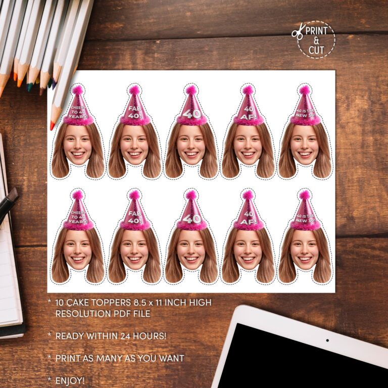 Celebrate the big 4-0 with plenty of laughs and style using these personalized photo cupcake toppers. Designed specifically for a milestone 40th birthday, this printable decoration transforms the guest of honor's face into the highlight of the dessert table. The design features a festive pink party hat with fuzzy trim and fun, cheeky phrases like "Fab 40!," "40 AF!," and "Cheers to 40 Years!" to set a lively tone. As a digital download, this allows you to print as many copies as you need from home or a local print shop. For the best impact, use a high-resolution, front-facing photo to ensure the facial features pop against the vibrant pink hat design.