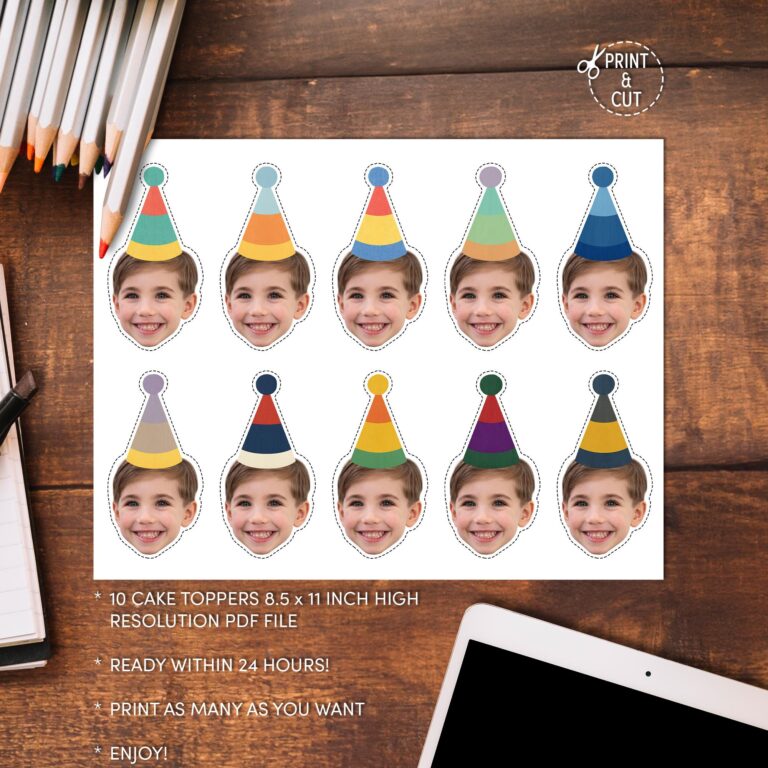 Add a burst of joy to your child's birthday celebration with these vibrant, custom face cupcake toppers featuring classic striped party hats. Ideal for toddlers and young children, this personalized decoration transforms your favorite photo into a fun, crowd-pleasing party accent. As a digital download, this product offers the flexibility to print as many copies as you need from the comfort of your home or through a professional print shop. The design features a variety of bright, festive hat colors with charming pom-pom details, making them a versatile choice for carnival themes, circus parties, or standard colorful birthday bashes. For the best results, we recommend providing a clear, well-lit photo so we can expertly crop the face to ensure a clean and professional look.