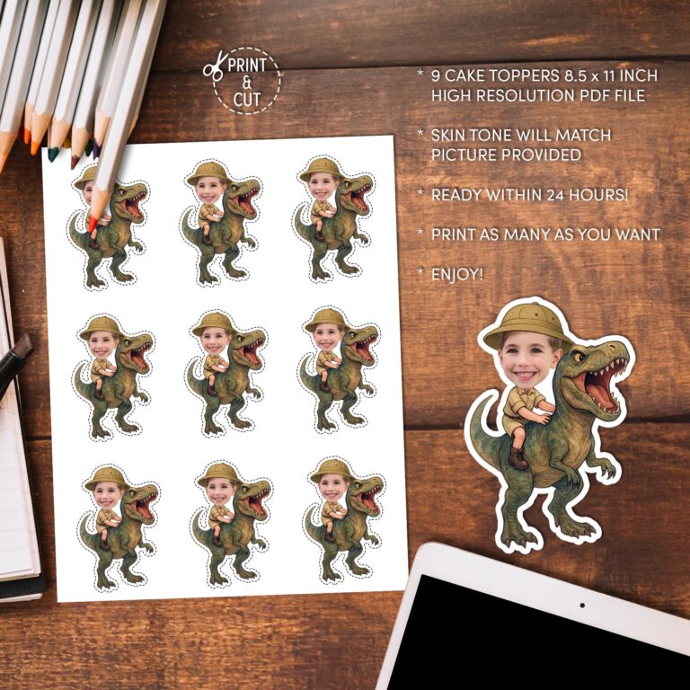 Transform the birthday guest of honor into a prehistoric adventurer with these hilarious and adorable custom face dinosaur cupcake toppers. Each design features a whimsical illustration of a safari explorer riding atop a roaring T-Rex, perfectly personalized with your child's photo. We carefully edit your submitted picture to fit under the safari hat and adjust the skin tone of the illustrated body to match, creating a seamless and high-quality look. Primarily designed for toddlers and young children who love Jurassic themes, these toppers add a unique focal point to your dessert table. This is a digital file, allowing you to print as many copies as you need for your event while ensuring the colors pop on high-quality paper.