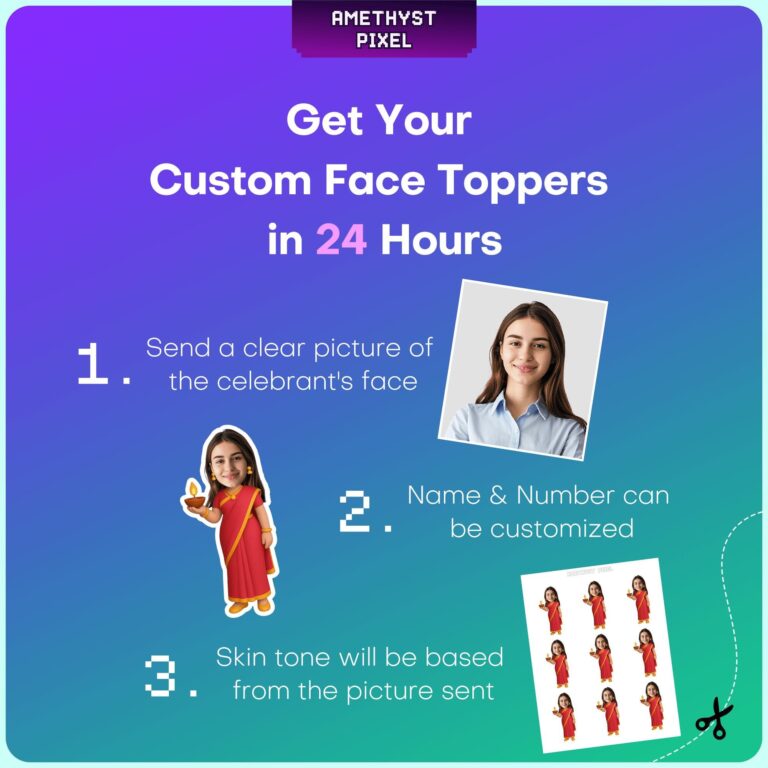 Celebrate the Festival of Lights with a truly personal touch by using these custom face Diwali cupcake toppers designed for young girls. The vibrant illustration features a child dressed in a traditional red saree with elegant gold trim, holding a glowing Diya oil lamp to symbolize the victory of light over darkness. Expertly crafted for ease of use, these printable cake picks allow you to seamlessly showcase your daughter's photo, making her the star of the Deepavali festivities. Whether you are hosting a large family gathering or a classroom cultural event, these high-resolution decorations add a layer of warmth and customization to your dessert table. They are perfect for topping not just cupcakes, but also traditional Indian sweets like mithai, blending time-honored traditions with modern party planning convenience.
