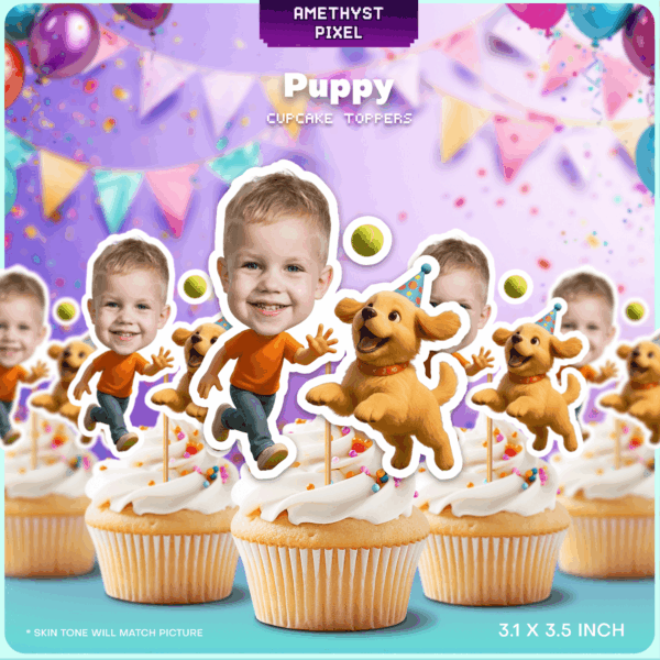 Custom Face Puppy Party Cupcake Toppers Printable - Fun Dog Theme Birthday Decoration