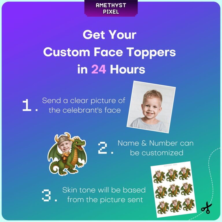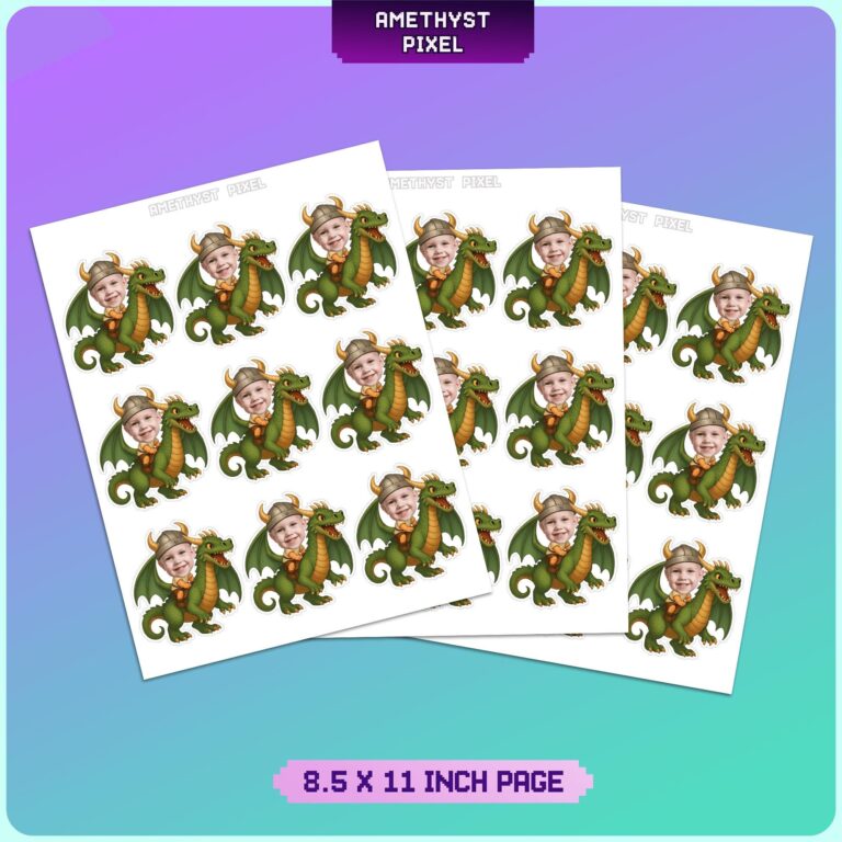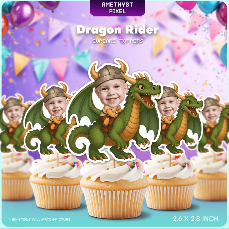 Ignite the imagination at your child’s next celebration by transforming them into a legendary hero with these adventurous dragon rider cupcake toppers. Expertly crafted for fantasy enthusiasts, this design features your little one’s face digitally mounted onto a brave Viking character, complete with a horned helmet and tunic, riding atop a magnificent green dragon. Perfect for toddlers and young children who dream of soaring through the skies, these personalized decorations bring a unique spark to dragon-themed birthdays or medieval fantasy events. The vibrant illustration captures the excitement of taming a mythical beast, serving as an unforgettable conversation starter on your dessert table. Whether you are hosting a movie marathon or a classic knights-and-dragons party, these custom photo toppers provide a high-quality, professional finish that turns ordinary cupcakes into magical treats.