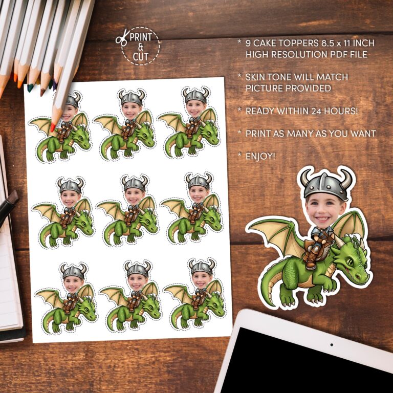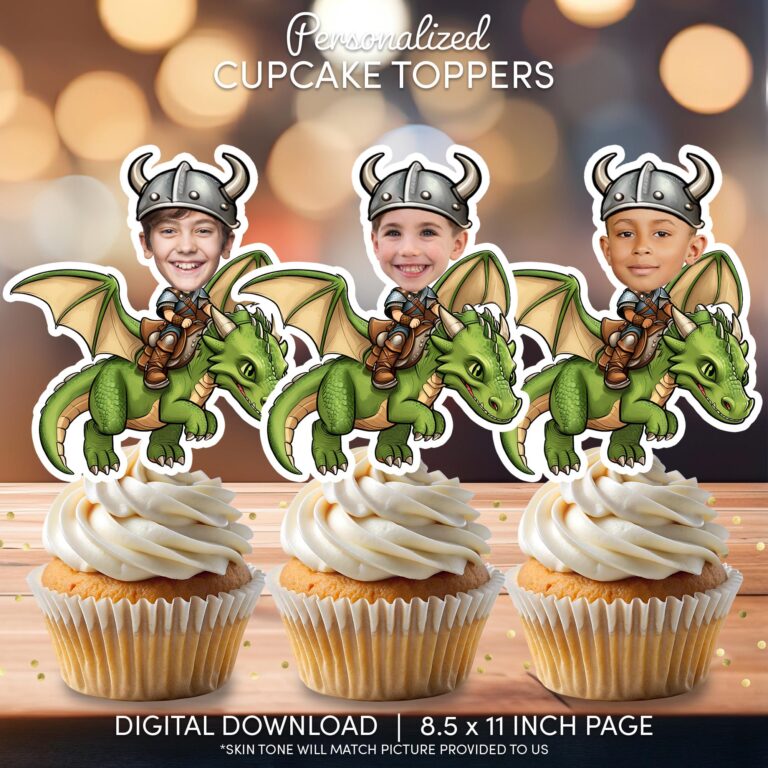 Transform your little adventurer into a legendary hero with these custom face dragon rider cupcake toppers. Perfect for fantasy-loving children, this printable design features a vibrant green dragon carrying a rider decked out in brown leather armor and a classic horned Viking helmet. We digitally personalize the topper with your child's photo, expertly matching the skin tone to create a seamless and hilarious look that guests will love. Most popular for boys and girls aged 4 to 10, these decorations bring a sense of epic adventure to any dessert table. As a digital download, this product allows you to print high-quality images from home on your own timeline, ensuring you have the perfect finishing touch for a medieval or dragon-themed celebration.