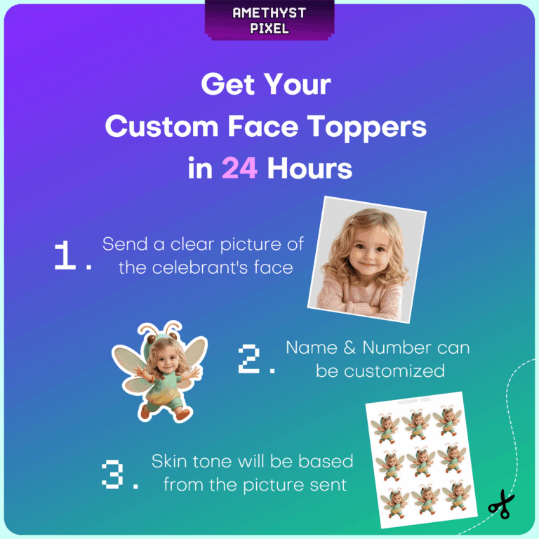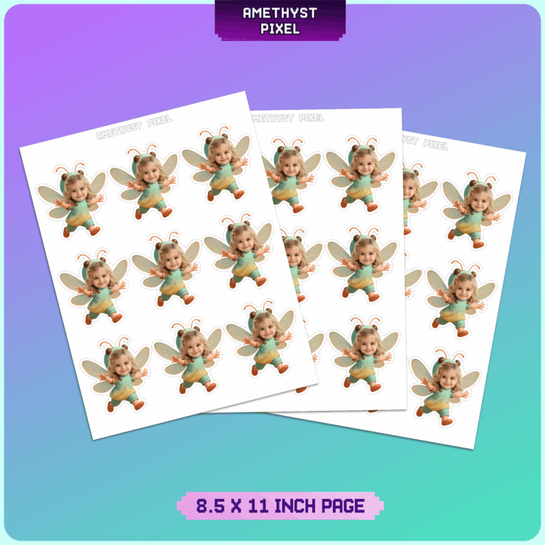 Transform your dessert table into a whimsical garden with these adorable custom face dragonfly cupcake toppers. Ideally suited for toddlers and young children celebrating a first birthday or bug-themed event, this design features your child's photo seamlessly edited onto a cute flying dragonfly body with teal and green attire, playful antennae, and delicate wings. As a printable digital download, this product offers a fun DIY project that ensures your party decor is completely unique. The high-resolution file is designed to be printed at home, giving you improved control over the final look. Simply print on quality paper and assemble to add a magical, personalized touch to your celebration.