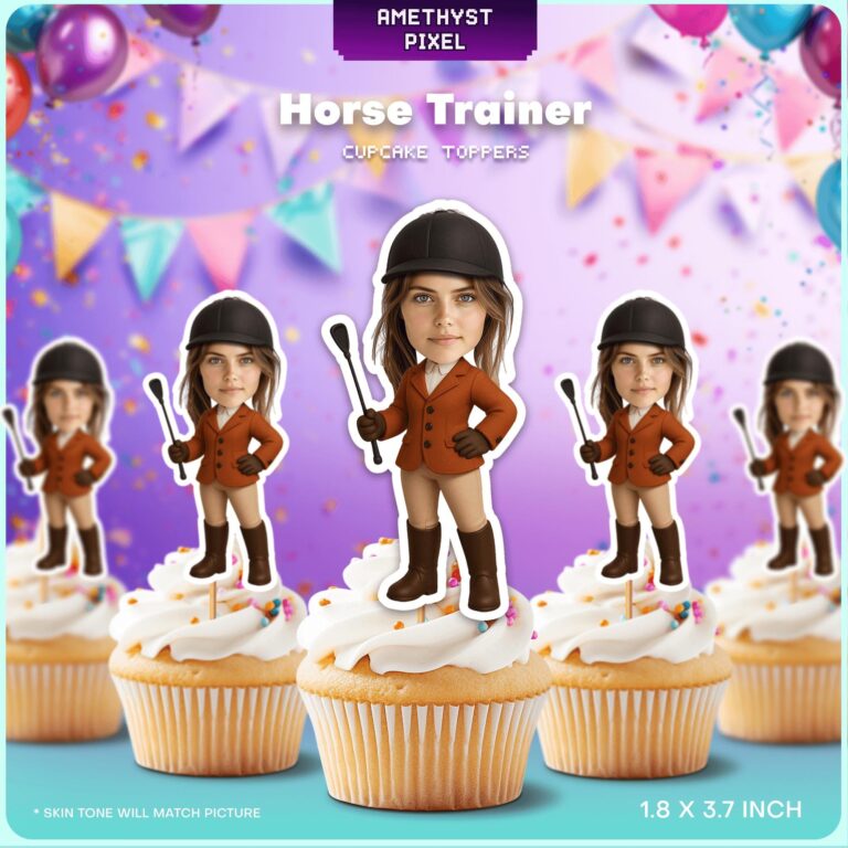 Celebrate your little rider's passion for horses with these professionally designed equestrian cupcake toppers. This charming design features a classic English riding habit, complete with a rust-colored hunt coat, tan breeches, tall riding boots, and a black velvet safety helmet. Your child's photo is expertly fitted onto the figure, holding a riding crop with the poise of a champion competitor. Ideal for pony club celebrations, Derby-themed birthdays, or stable parties, these toppers add a tailored touch to your dessert table. Simply upload a clear photo to create a personalized decoration that captures the spirit of the sport. The layout is optimized for easy home printing and cutting, ensuring a high-quality finish for your equestrian event.