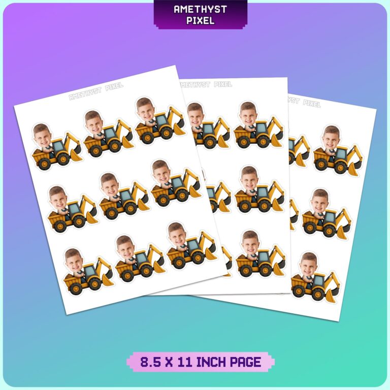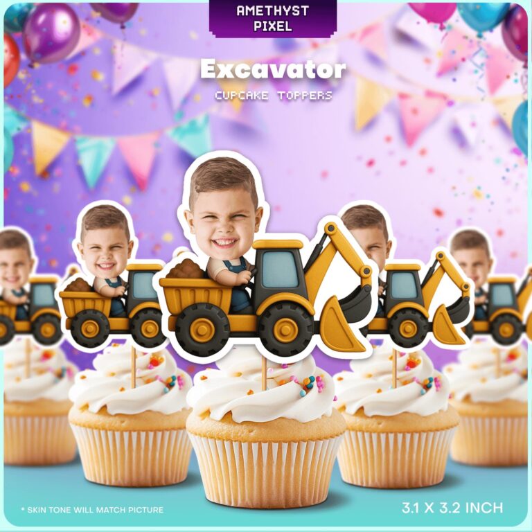 Transform your little builder’s dessert table into an exciting active construction zone with these personalized face cupcake toppers. Expertly designed for toddlers and young children who are fascinated by heavy machinery, this printable decoration creates a hilarious and adorable illusion of your child driving a heavy-duty yellow excavator. The design features remarkably detailed graphics, including chunky tires, a movable arm, and a classic yellow chassis, sized perfectly at approximately 3 inches to stand out on standard or jumbo cupcakes. As an experienced party planner knows, integrating the birthday boy's photo into the décor instantly elevates the theme and provides a fantastic photo opportunity for guests. These digital toppers offer a high-quality, DIY solution that allows parents to produce professional-looking party decor from home, ensuring the skin tone matches the provided photo for a seamless look.