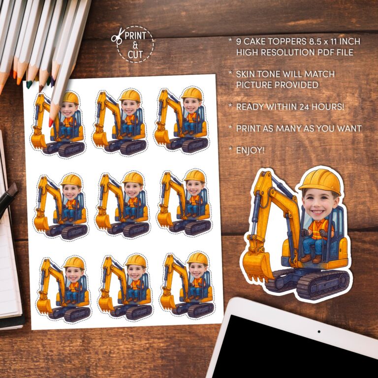 Custom Face Excavator Cupcake Toppers – Personalized Construction Birthday Party Decorations