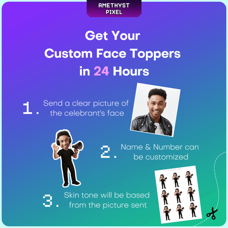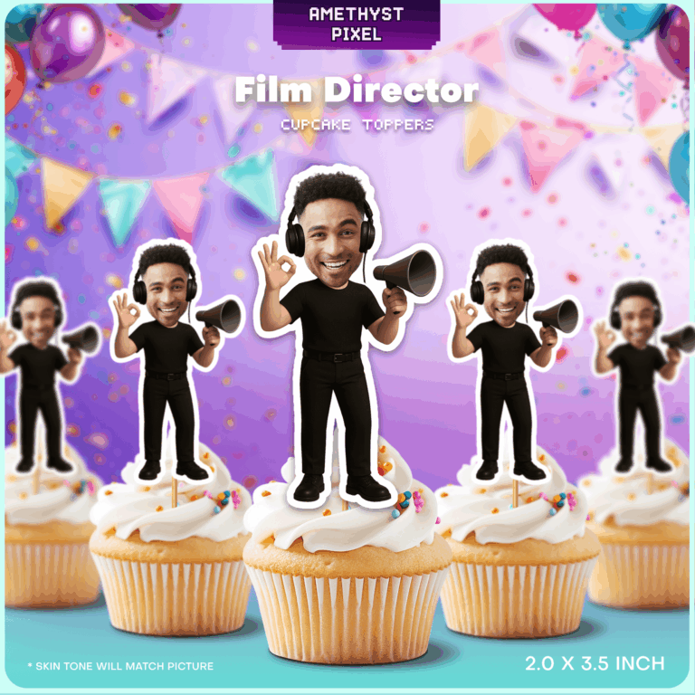 Call "Action!" on your next celebration with these custom face film director cupcake toppers, perfect for bringing a touch of Hollywood to your dessert table. Designed for movie buffs, aspiring filmmakers, and cinema lovers of all ages, this printable decoration features a classic director's ensemble—complete with an all-black outfit, studio headphones, and a megaphone prop. Simply provide a high-quality photo of the guest of honor, and receive a digital file ready for home printing. The design captures the excitement of being on set, making it an excellent conversation starter for movie nights or birthday bashes. For the best results, we recommend printing these on sturdy cardstock to ensure the microphone and headphones hold their shape once cut and assembled.