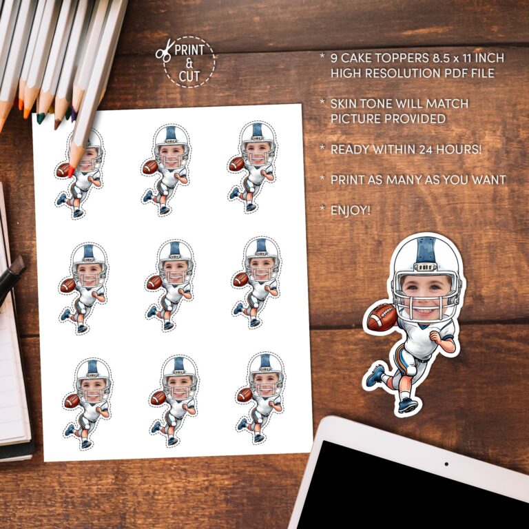 Score a touchdown at your next celebration with these personalized football player cupcake toppers featuring your child's face. This digital download transforms your guest of honor into a star athlete, showcasing an action-packed cartoon body running with a football in a white and blue uniform. We professionally crop your submitted photo and adjust the cartoon skin tone to match the picture provided, ensuring a seamless and high-quality look. Perfect for sports fans and little athletes, these DIY printable toppers bring humor and excitement to the dessert table. The file arrives ready for you to print on sturdy cardstock, cut out, and assemble for a memorable game-day touch.