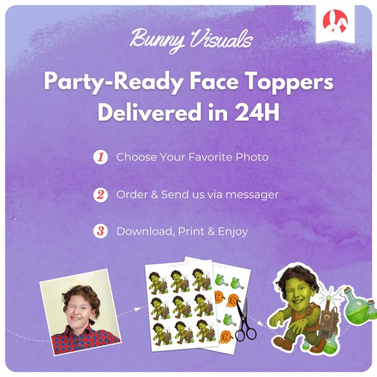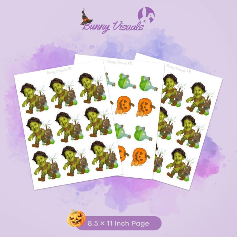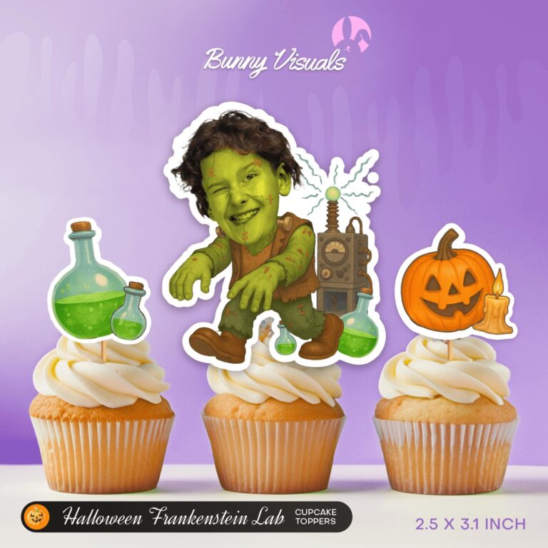 Electrify your dessert table this season with these expertly crafted Frankenstein monster cupcake toppers, featuring your child’s face professionally integrated onto a classic green monster body. Our design process includes tinting the uploaded photo green to match the character’s scarred skin, ragged vest, and heavy boots, ensuring a seamless and high-quality visual finish. The layout is enhanced by vibrant illustrations of glowing pumpkins, bubbling chemical beakers, and sparking electrical machinery, creating the perfect atmosphere for a Mad Scientist or Monster Bash theme. These digital printables offer a convenient, professional solution for parents wanting to add a humorous and personalized touch to Halloween parties or spooky birthday events for boys.