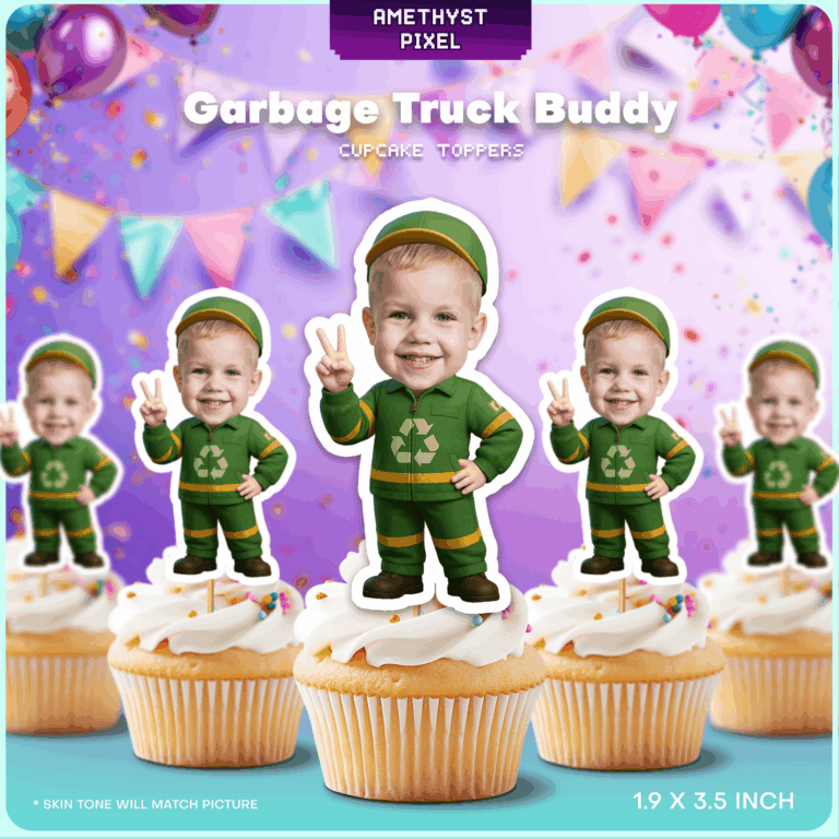 Make trash day the highlight of the year with these custom face cupcake toppers, designed specifically for toddlers and young children who love watching the recycling truck pass by. This printable party decoration features your child's photo superimposed onto a cheerful sanitation worker body, dressed in a green uniform with yellow stripes, a matching cap, and a classic recycling symbol on the chest. The character strikes a fun pose with a peace sign, adding personality to your 'Trash Bash' or eco-friendly celebration. As a digital download, this allows you to print as many as you need at home, ensuring high-quality results when paired with bright white cardstock and a clear photo.