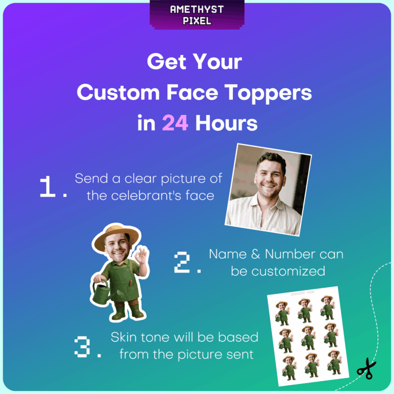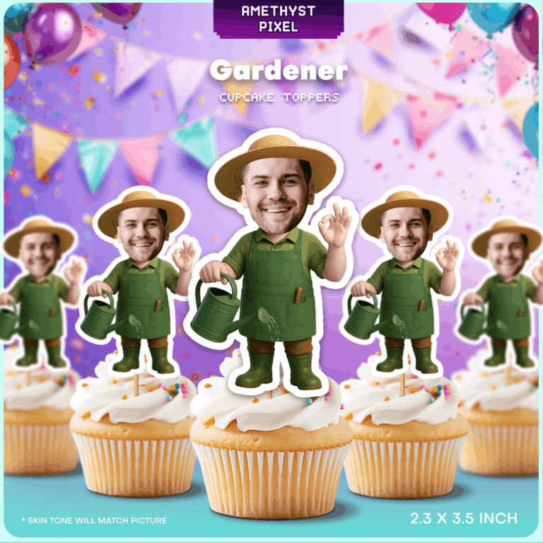 Celebrate the plant lover in your life with these charming custom face gardener cupcake toppers. This printable design features a classic gardening outfit complete with a wide-brimmed straw hat, a sturdy green apron, rain boots, and a watering can, making it the perfect tribute for anyone with a green thumb. Best suited for adults and seniors—especially for retirement parties or milestone birthdays—this DIY decoration adds a humorous and personal touch to your dessert table. Simply provide a high-quality photo to have the face professionally cropped and matched to the playful gardener body. Once you receive your digital file, you can print as many copies as you need at home for a lush, garden-themed celebration.