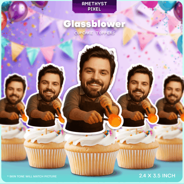Personalized Glassblower Face Cupcake Toppers for Artisan Birthdays & Retirement