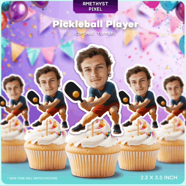 Custom Face Pickleball Player Cupcake Toppers for Sports Themed Birthdays & Retirement