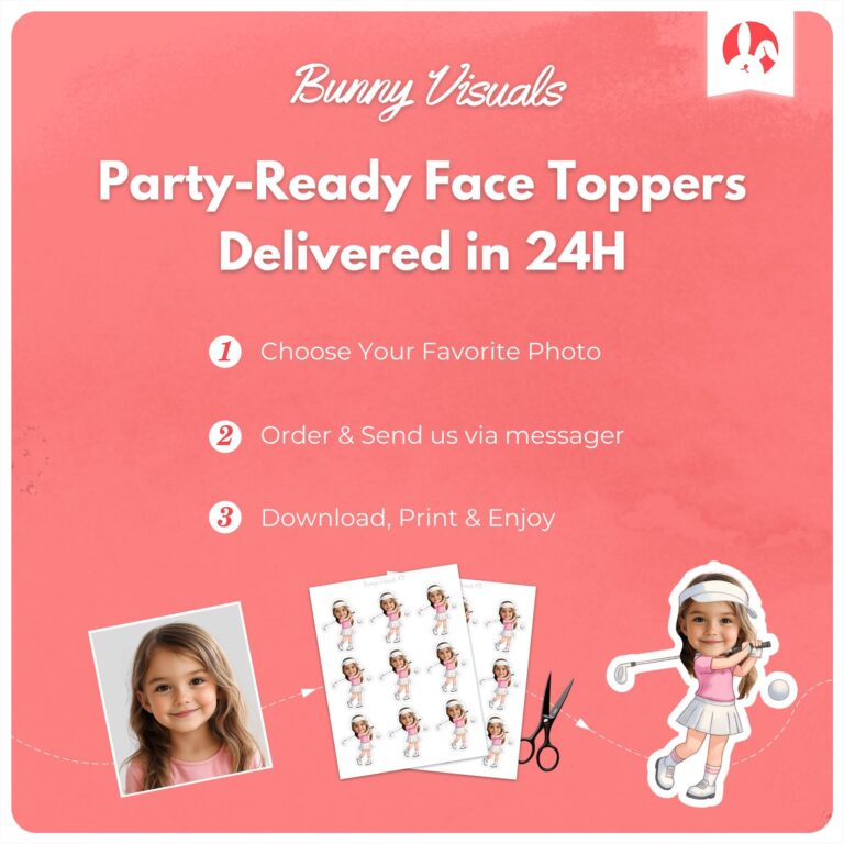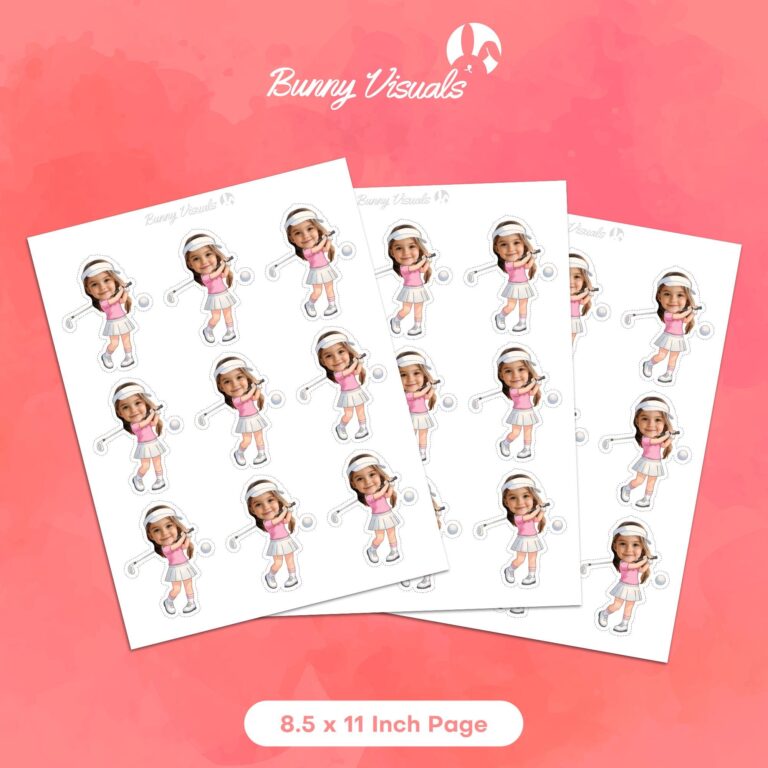 Tee up a memorable celebration with these professionally designed golf-themed cupcake decorations, specifically illustrated for young girls. The design features a sporty character dressed in a classic pink polo, white skirt, and tennis visor mid-swing, ready to drive a ball down the fairway. By adding your child's photo to these 3.0 x 3.5 inch printable cutouts, you create a personalized centerpiece that instantly elevates any "Par-Tee" or country club birthday event. These digital files ensure high-resolution printing, allowing parents to easily craft distinct, professional-looking dessert toppers that capture the birthday girl's personality while fitting perfectly into a junior golf or sports-themed atmosphere.