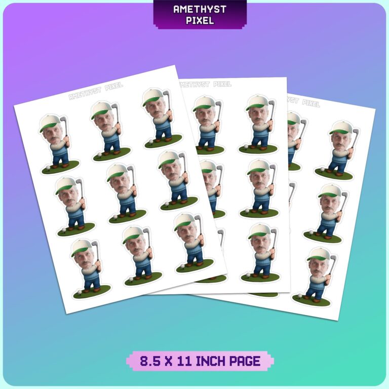 Tee up a memorable celebration with these expertly designed custom face golf cupcake toppers, specifically tailored for the golf enthusiast in your life. Whether you are planning a retirement send-off for a colleague or a milestone birthday for Dad or Grandpa, these personalized decorations add a distinct touch of humor and personality to your event. The illustration features a classic golfer character dressed in a traditional blue sweater vest, jeans, and a cap, poised with a club over a ball on a grassy green base. By integrating a high-resolution photo of your guest of honor, you transform standard desserts into a standout feature of the party theme. Available as a high-quality digital printable, this DIY decor solution ensures you can produce professional-looking toppers right from home, perfectly sized at approximately 2.6 x 3.4 inches for standard cupcakes.