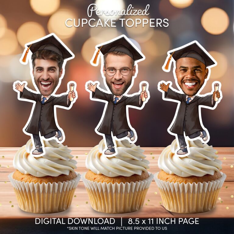 Custom Face Graduation Cupcake Toppers – Printable Black Gown Photo Decorations