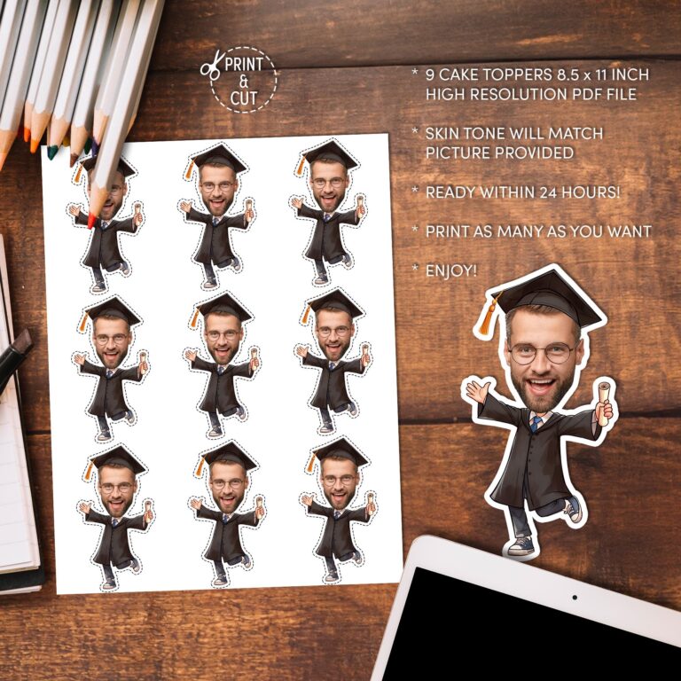 Celebrate your graduate's big achievement with these personalized photo cupcake toppers, perfect for adding a fun and memorable touch to any commencement party. Designed for high school seniors, college graduates, or masters degree recipients, this digital template features a jubilant cartoon body wearing a classic black graduation gown and mortarboard cap, jumping joyfully with a diploma in hand. We carefully customize the illustration to match the skin tone of the photo you provide, ensuring a seamless and professional look. Upon receiving your digital file, you can easily print as many as you need right from home. These custom cutouts act as excellent conversation starters and look fantastic on everything from frosted cupcakes to savory appetizers.