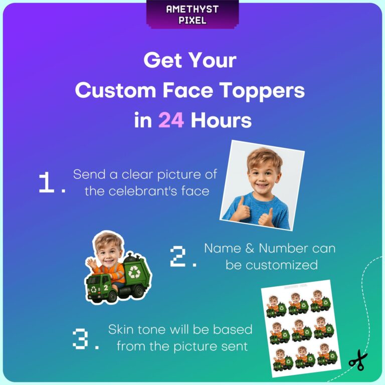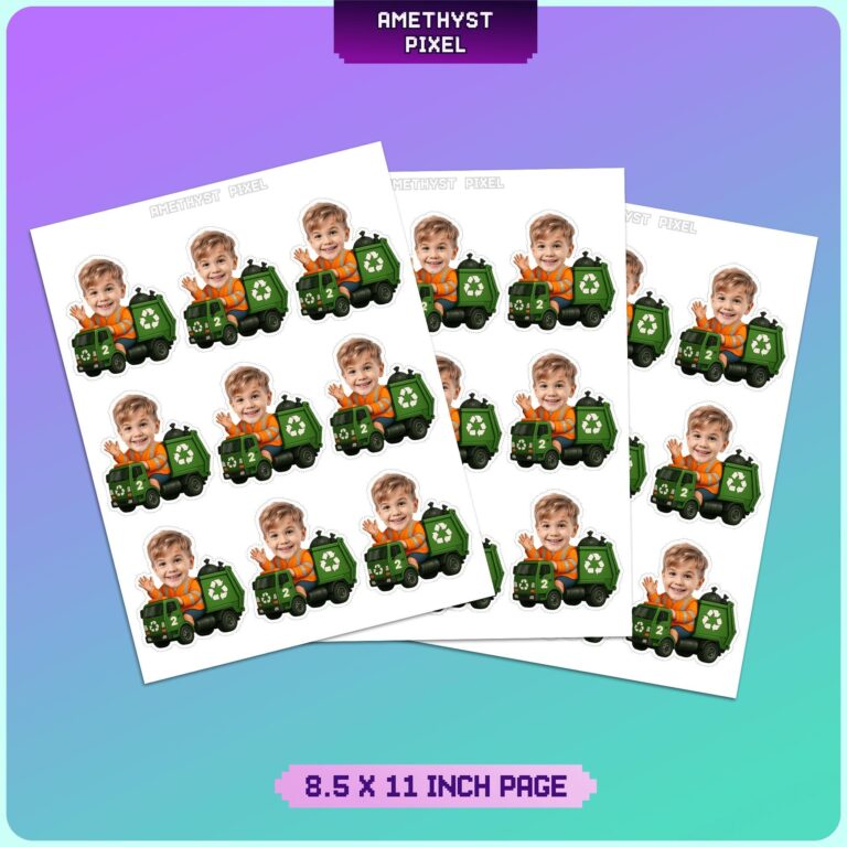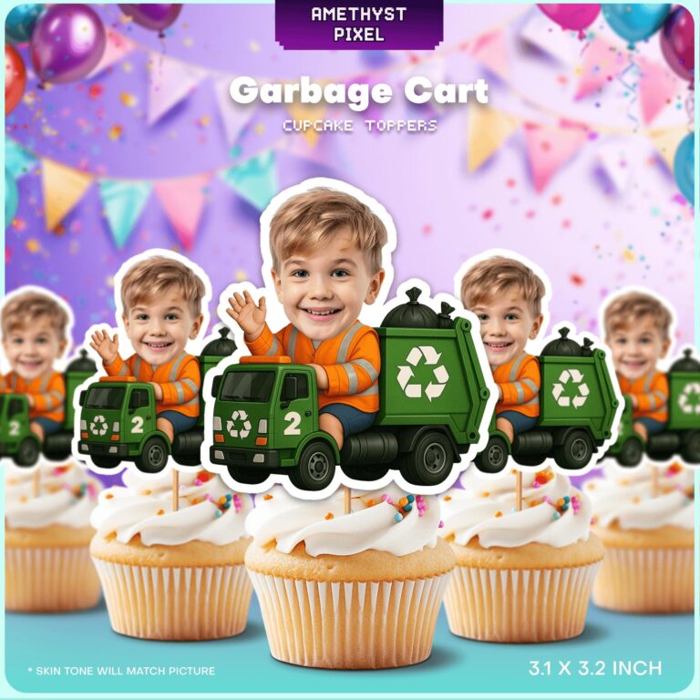 Transform your little one into the star of their very own sanitation squad with these personalized garbage truck cupcake toppers. Designed specifically for toddlers who are fascinated by the excitement of trash collection day, this custom design features your child’s smiling face superimposed onto a hardworking sanitation driver. The character is outfitted in a high-visibility orange safety vest with reflective stripes, sitting atop a sturdy green recycling truck loaded with black trash bags and marked with the white recycling symbol. perfectly suited for a 'Trash Bash' or eco-friendly themed birthday celebration, these printable decorations bring humor and personality to your dessert table. Whether for a second birthday or a general truck-lover's party, these high-quality toppers capture the joy of big machinery in a kid-friendly, celebratory format.