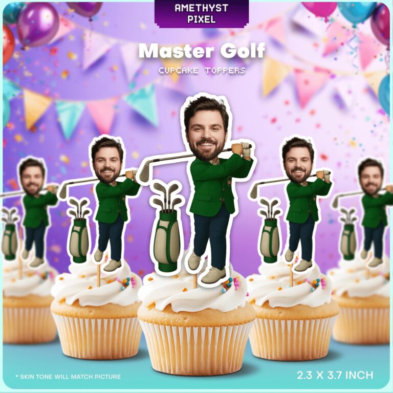 Celebrate the ultimate achievement on the fairway with these professionally designed golf-themed party decorations. Tailored specifically for adults celebrating a milestone birthday, retirement, or a tournament victory, this design features your guest of honor donning the iconic green blazer synonymous with major championship excellence. The illustration showcases a confident golfer completing a powerful swing, accompanied by a detailed equipment bag, bringing an authentic country club atmosphere to your dessert table. These printable toppers are an excellent choice for showing appreciation to the golf enthusiast in your life, combining high-quality visual humor with a prestigious sports aesthetic. Each topper is crafted to ensure the uploaded photo integrates seamlessly with the golfer's physique for a polished, celebratory look.