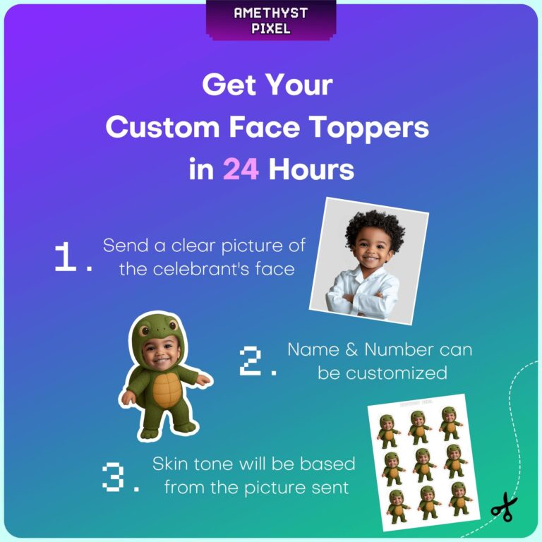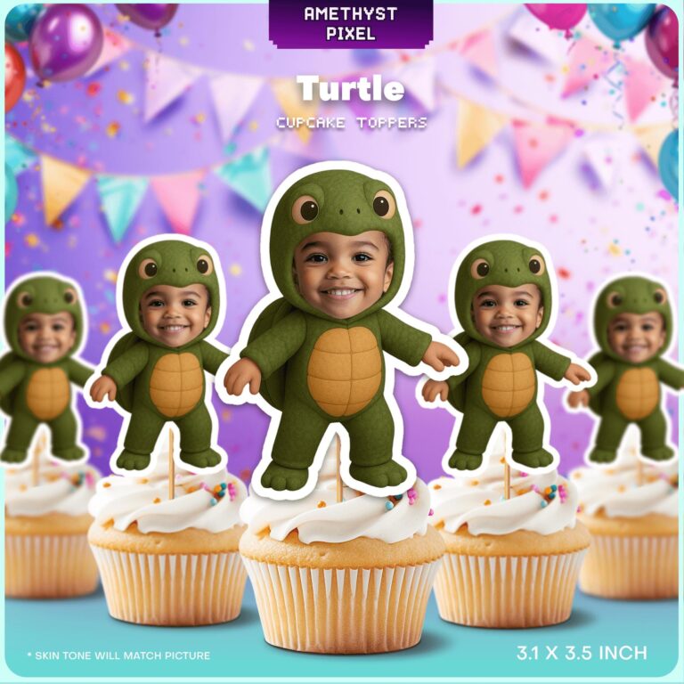 Transform your dessert table into a delightful aquatic adventure with these expertly designed custom turtle cupcake toppers. Perfectly suited for toddlers and young children, this printable decoration features a soft green turtle costume body complete with a classic segmented belly shell and a friendly hooded character head. By integrating your child's smiling photo into this whimsical design, you create a unique focal point for any "Under the Sea" or zoo-themed celebration. These high-resolution toppers are sized at approximately 3.1 x 3.5 inches, ensuring they stand out clearly on standard cupcakes or muffins. Whether you are planning a "Shell-ebration" for a first birthday or a fun reptile-themed gathering, these DIY printable cutouts provide a professional, trustworthy, and memorable way to honor the birthday boy or girl.