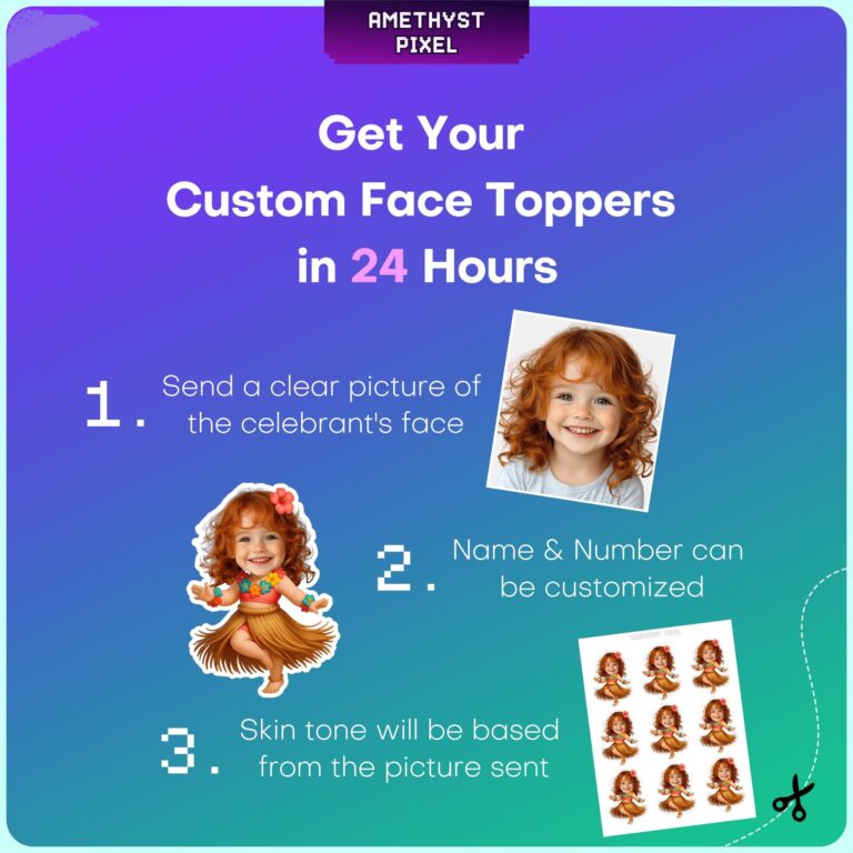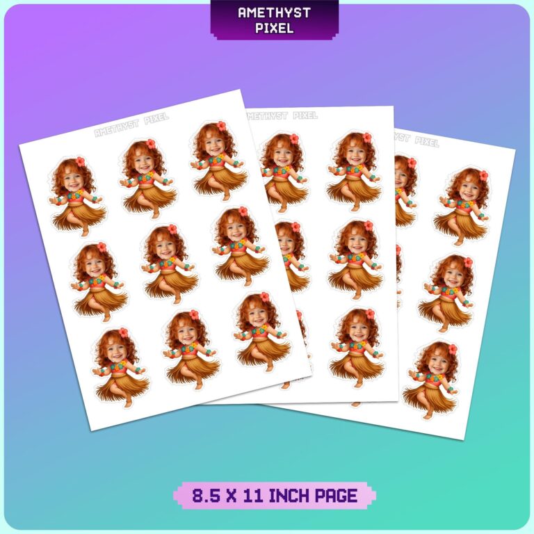 Transform your dessert table into a tropical paradise with these Custom Face Hawaiian Hula Dancer Cupcake Toppers, specifically designed for toddlers and young children celebrating island-themed milestones like a first birthday or summer bash. The vivid design showcases an energetic little dancer adorned in a classic grass skirt, a vibrant flower lei, and a blossom tucked into her hair, exuding pure joy and rhythm. By professionally blending your child's photo with the character, we create a heartwarming and personalized decoration that serves as the perfect conversation starter for family gatherings. Measuring approximately 2.4 x 3.4 inches, these toppers make a bold visual statement on standard cupcakes without overpowering the frosting. Whether you are hosting a backyard luau or a splashy pool party, these high-resolution personalized accents provide a polished, expert look to your event.