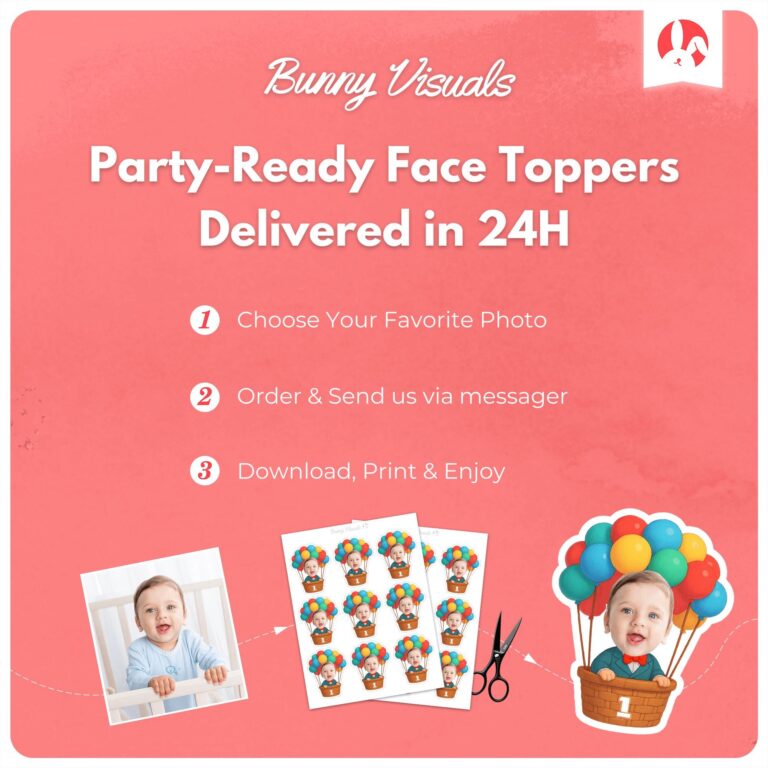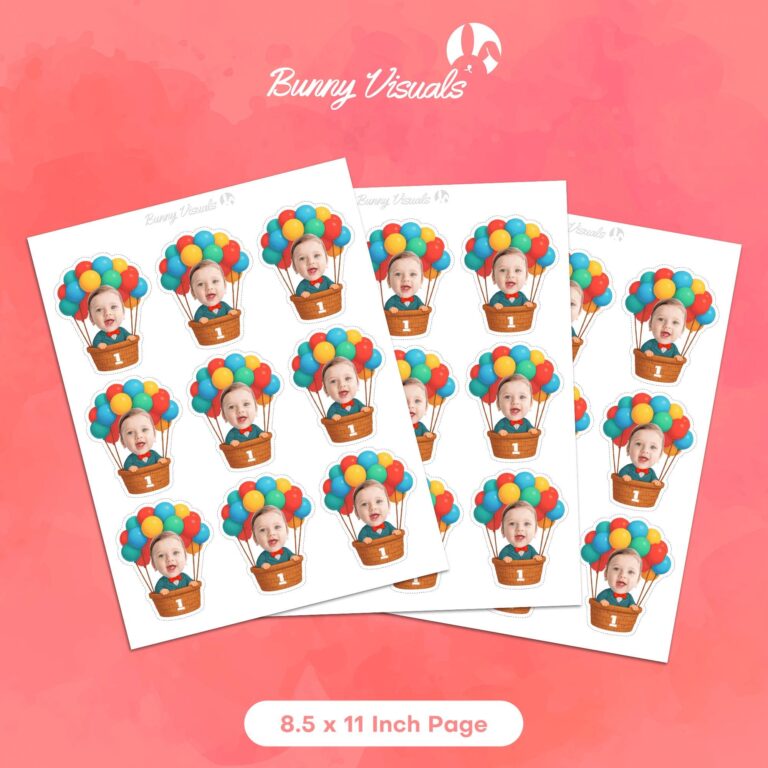 Elevate your little pilot's milestone celebration with these charming custom face hot air balloon cupcake toppers, designed explicitly for "Up, Up and Away" themed first birthday parties. The high-quality artwork features a classic woven basket illustration bearing the number one, carrying your baby’s photo fashioned in a dapper suit and red bow tie beneath a buoyant cluster of primary-colored balloons. As an expert-approved solution for DIY party planning, these printable decorations instantly transform standard bakery treats into a cohesive, high-flying centerpiece. Ideal for parents seeking a personalized touch, these 2.8 x 3.5 inch toppers provide professional-grade visuals for your dessert table, ensuring every photo taken at the event captures the joy of your child's big adventure.