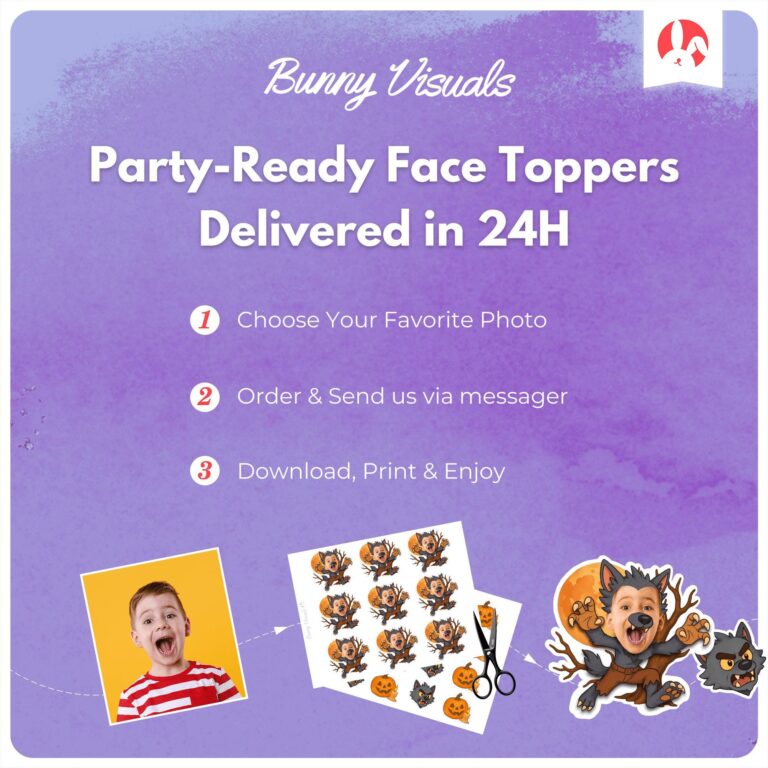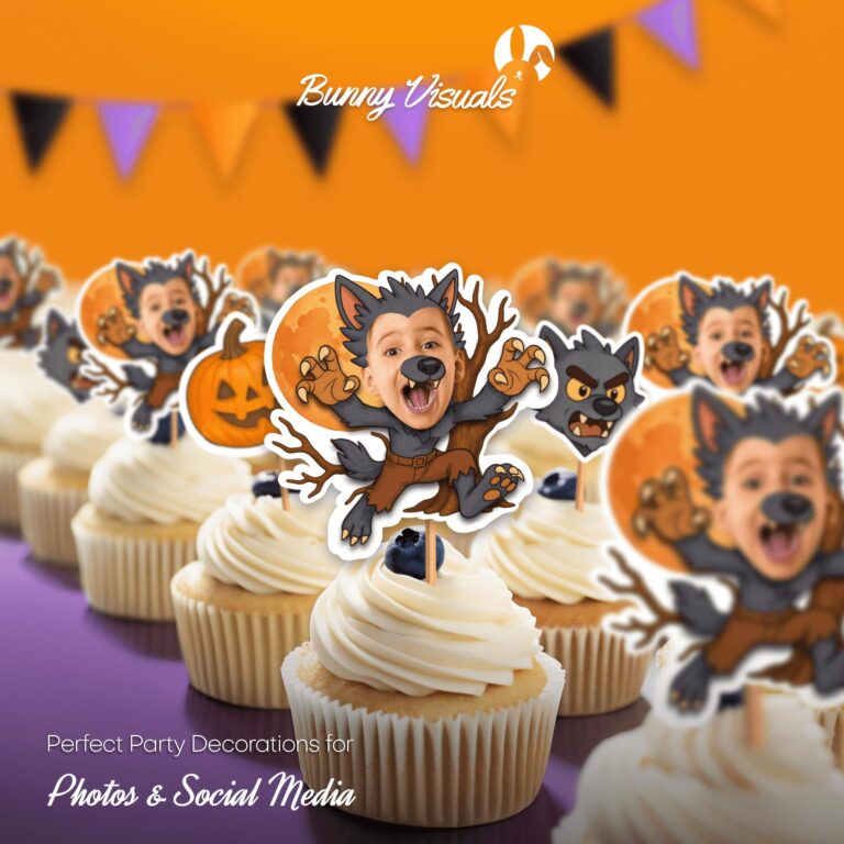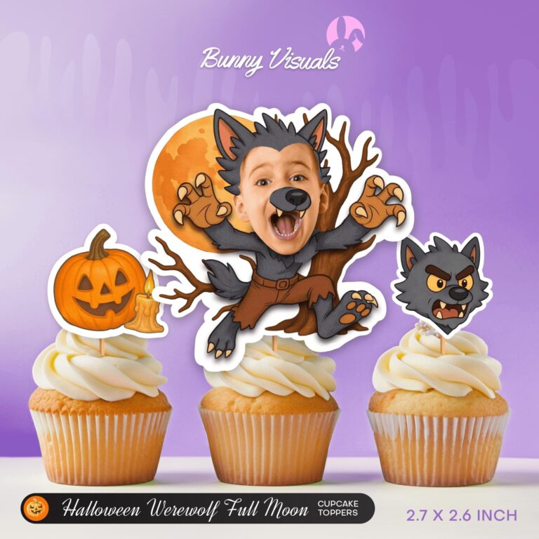 Transform your little monster into the star of the spooky season with these expertly designed custom werewolf cupcake toppers. Ideal for children who love a playful scare, this design features your child’s photo superimposed onto an energetic, grey-furred werewolf leaping in front of a giant orange full moon. The illustration includes high-quality details such as spooky bare tree branches, sharp but kid-friendly claws, and a smiling Jack-o'-lantern, making it the perfect centerpiece for Halloween bashes or October birthdays. As experienced party planners know, personalized edible decor significantly boosts engagement at events. These printable decorations are easy to assemble at home; simply print, cut, and attach to picks to create a memorable, 'spooktacular' dessert table display that parents and kids will howl about.