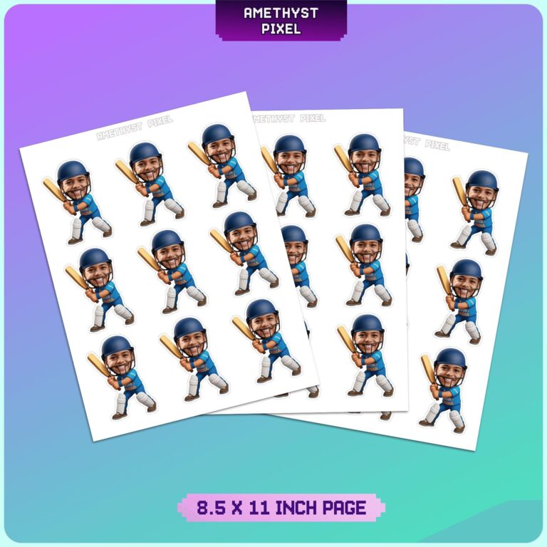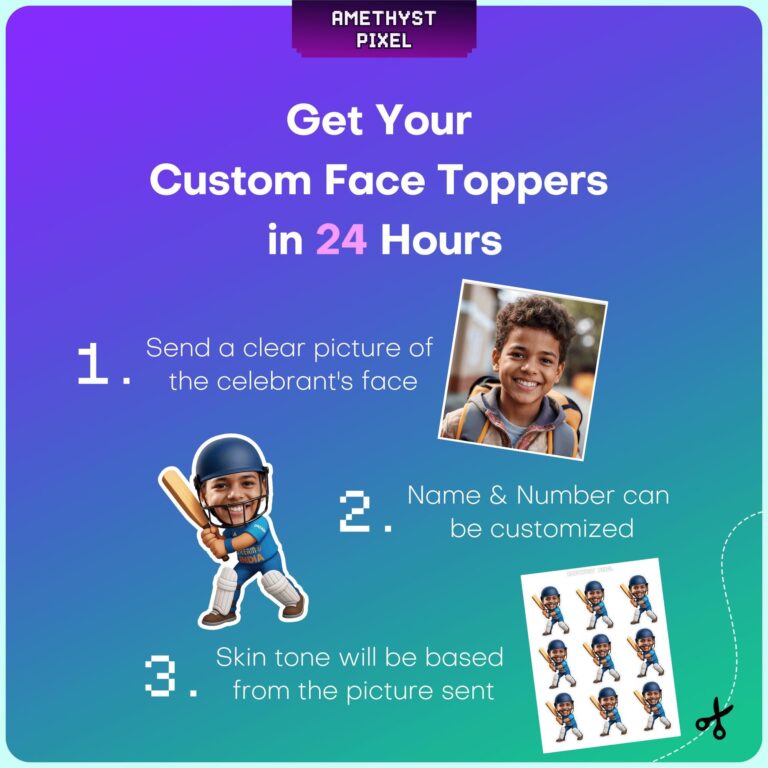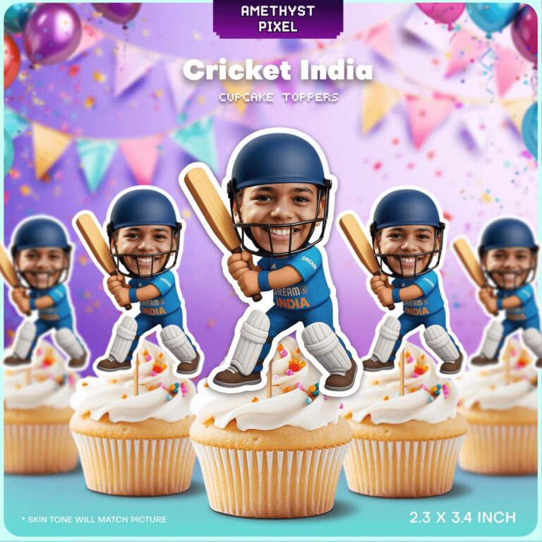 Transform your dessert table into a stadium celebration with these professionally designed custom face cupcake toppers, featuring a batsman in the iconic blue India cricket kit. Perfect for die-hard fans and aspiring athletes, this digital printable design places your birthday star’s photo directly onto the body of a cricket player geared up with protective pads, a helmet, and a bat poised for action. These personalized decorations add a unique, humorous, and spirited touch to any cricket birthday party or tournament viewing event. As a high-resolution DIY file, you can easily print and assemble these toppers at home, ensuring a crisp, vibrant finish that captures the energy of the sport while celebrating your favorite little champion.