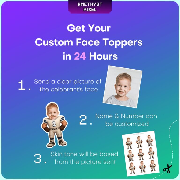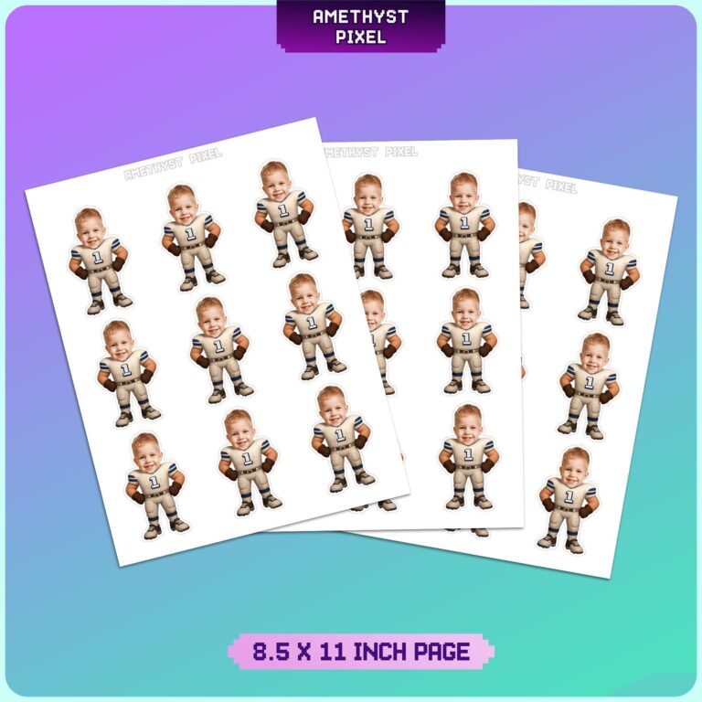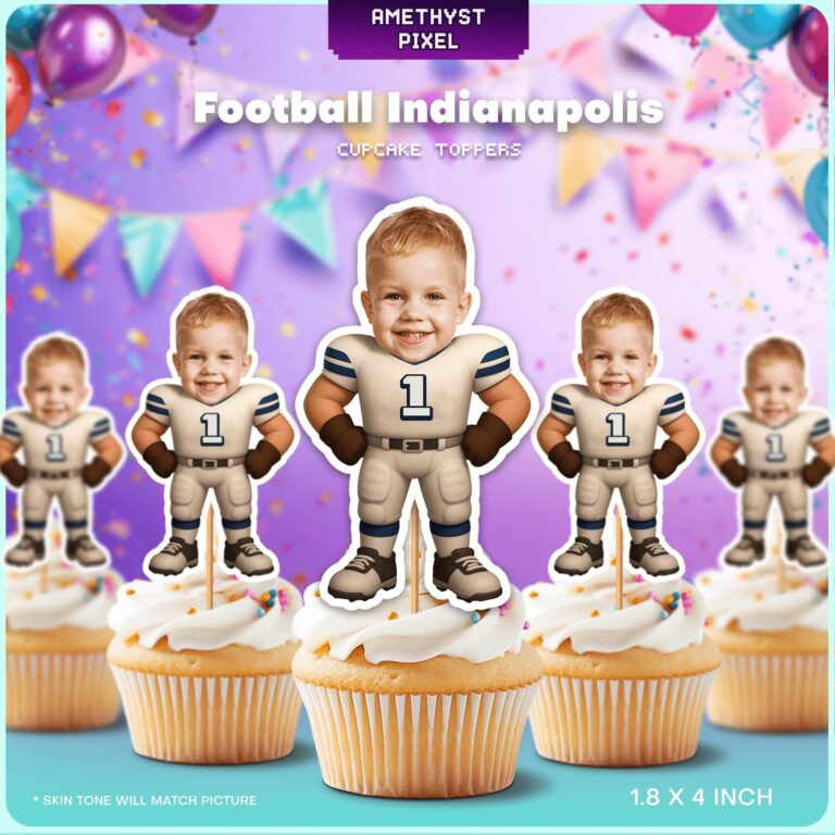 Score a touchdown at your next event by featuring your little one as the star player with these Indianapolis-inspired custom face cupcake toppers. Expertly designed for toddlers and young boys, each topper showcases a detailed white and blue football uniform complete with protective pads, gloves, and cleats. The sturdy 'Number 1' on the jersey makes this particularly excellent for 'Rookie of the Year' first birthday parties or celebrating a dedicated young fan during the season. These personalized decorations serve as a high-quality conversation starter, turning standard bakery treats into a spirited tribute to your favorite Indianapolis team. Whether you are hosting a game day gathering or a milestone birthday, these photo-integrated toppers bring professional flair and fun to your dessert spread.