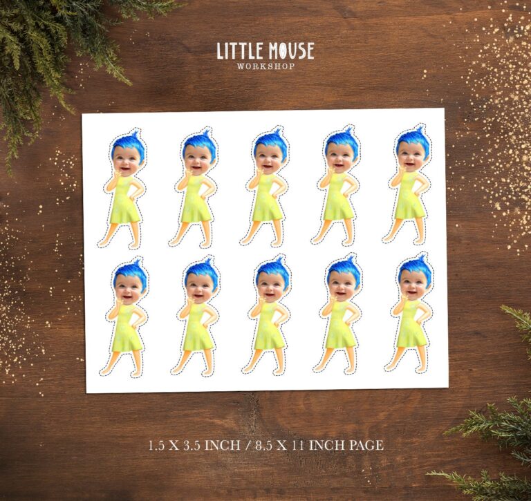 Inject pure happiness into your next celebration with these custom face Inside Out Joy cupcake toppers, designed to transform your child or guest of honor into the effervescent leader of the emotions. Featuring Joy’s signature star-patterned chartreuse dress and vibrant blue hair, this digital template is expertly personalized by blending your provided photo onto the animated body. Perfect for toddler birthdays or 'Core Memory' milestone events, we carefully adjust the character's skin tone to harmonize with your uploaded picture for a professional, seamless aesthetic. These printable files are delivered ready-to-print on standard letter-sized paper, making it simple for busy parents to create high-quality, themed dessert table decor right from home without professional equipment.