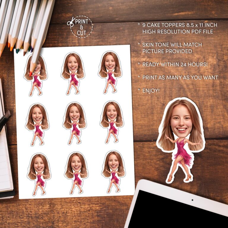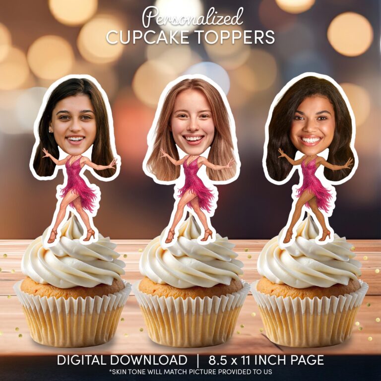 Bring the high-energy excitement of the ballroom to your celebration with these custom face Latin dancer cupcake toppers. Designed for bachelorette parties, dance-themed birthdays, or viewing parties for favorite televised dance competitions, these printable decorations feature your guest of honor's photo seamlessly edited onto a sparkling pink fringe salsa dress. We handle the professional editing, including extracting the face from your photo and meticulously matching the body's skin tone to the subject provided for a realistic and cohesive look. This is a digital-only product, allowing you to print as many copies as needed from home. The vibrant pink costume and dynamic dance pose make these an instant conversation starter and a fun photo opportunity for any adult or teen party.