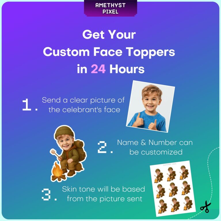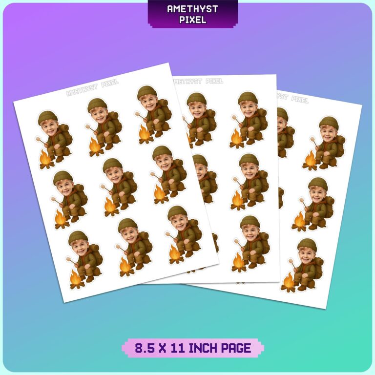 Transform your dessert table into a woodland adventure with these highly detailed camping birthday cupcake toppers. Designed for the little explorer in your life, this custom printable features a charming illustration of a child sitting on a rustic log, wearing a cozy knit beanie and a heavy hiking backpack. The character is depicted roasting a marshmallow on a stick over a vibrant campfire, making it the perfect centerpiece for a "One Happy Camper" celebration or an outdoor scouting event. These DIY photo toppers allow you to seamlessly integrate your child's face into the design, creating a personalized and memorable touch that guests will love. Ideal for parents seeking high-quality, professional party dĂ©cor, these cutouts work beautifully on cupcakes, donut stacks, or even as decorative accents for a sâmores station.