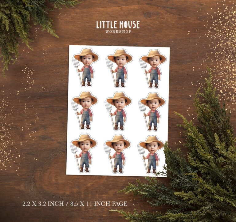 Bring the charm of the countryside to your little one's celebration with these professionally designed farm-themed photo decorations. Perfect for a barnyard bash or a rustic first birthday, this custom design features your child’s face seamlessly integrated onto an adorable toddler farmer body, dressed in classic blue denim overalls, a red gingham plaid shirt, sturdy brown boots, and a wide-brimmed straw hat while holding a pitchfork. As experienced creators of personalized party printable supplies, we ensure every detail—from the texture of the straw hat to the folds in the denim—is rendered in high resolution for a crisp, high-quality finish. These toppers are optimized for standard cupcakes at approximately 2.2 inches wide by 3.2 inches tall, making them substantial enough to stand out on a dessert table without overwhelming the treats. Whether you are planning a petting zoo party or a 'First Rodeo' event, these unique cutouts provide a humorous and heartwarming focal point that guests love.