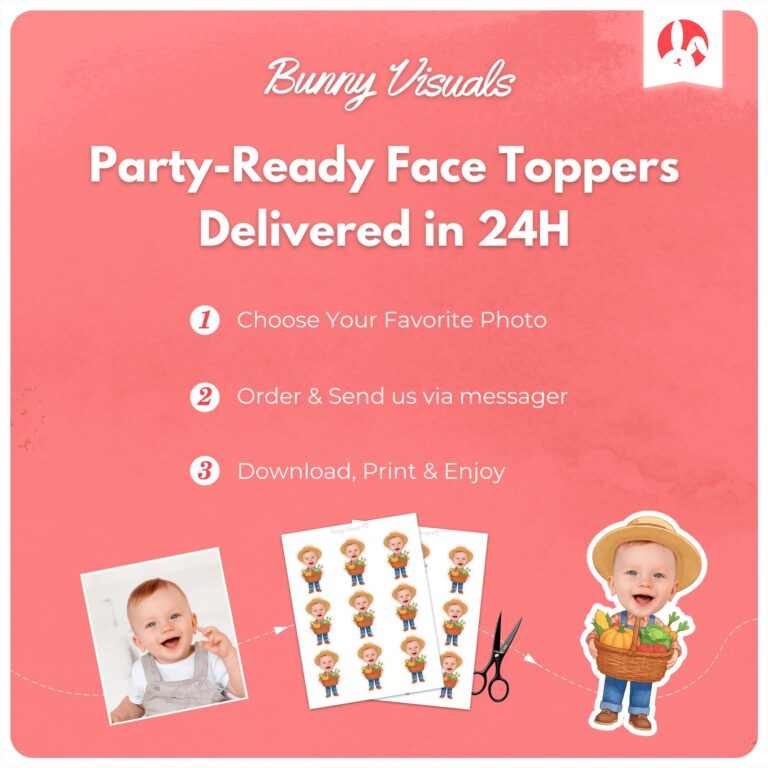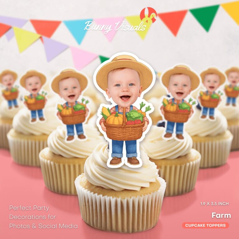 Bring the charm of the countryside to your celebration with our uniquely designed custom face little farmer cupcake toppers. Specifically crafted for toddlers and babies celebrating a barnyard birthday or harvest event, this illustration depicts your child donning a classic straw hat and blue dungarees, proudly holding a basket brimming with fresh vegetables like pumpkins and corn. As specialists in personalized party decor, we understand that high-quality visuals are essential for creating memorable photo opportunities; therefore, we meticulously edit your uploaded photo to blend seamlessly with the rustic artwork. These printable toppers are a practical and expert solution for parents looking to add a bespoke touch to a "farm fresh" party theme. Whether used on muffins, cake slices, or savory appetizers, these decorations reliably enhance the thematic consistency of your event while highlighting the birthday boy or girl.