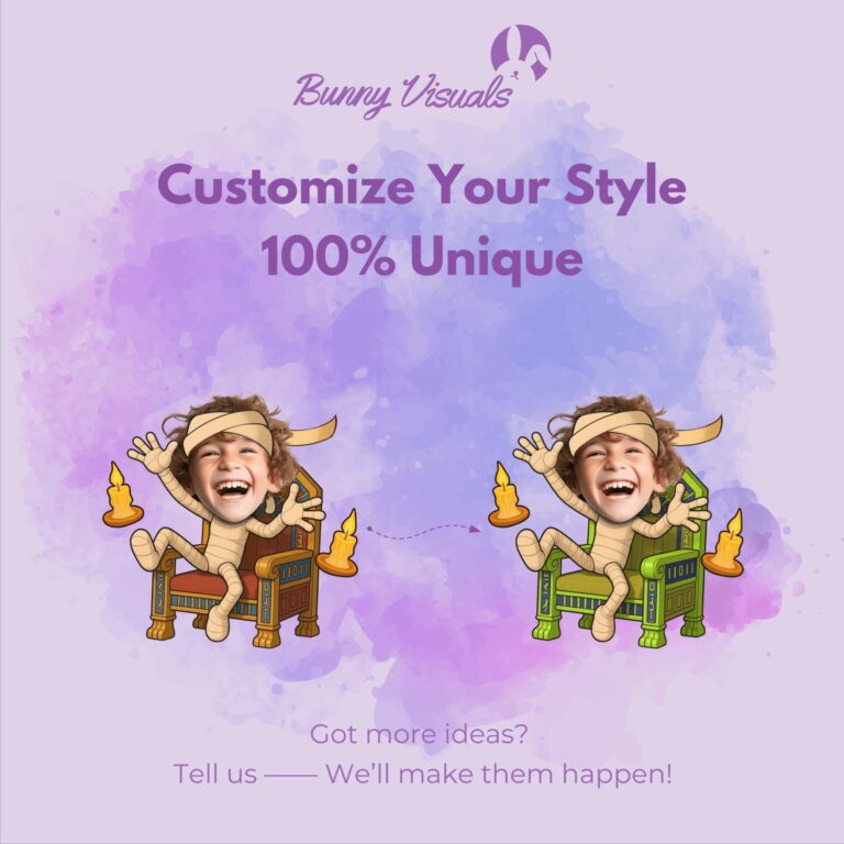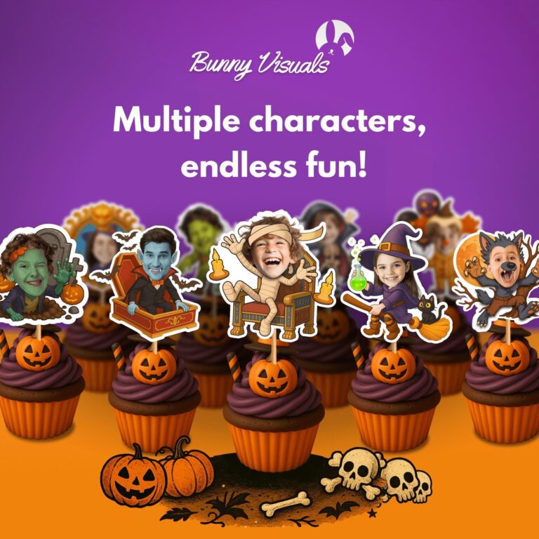 Transform your dessert table into an ancient crypt of fun with these custom face mummy cupcake toppers, designed specifically to add a personalized touch to Halloween parties and themed birthday celebrations. The illustration features a comical mummy body wrapped in classic linen bandages, sitting casually on an ornate Egyptian-style throne, making it a perfect fit for toddlers and young children who enjoy the playful side of spooky season. Surrounding the main character are festive details like a glowing jack-o'-lantern and a skull with a melting candle, ensuring the vibe remains lighthearted rather than frightening. Ideal for parents seeking unique DIY party decor, these printable toppers turn a simple photo of your child into the star of the event. They work exceptionally well for October birthdays or classroom celebrations where you want to combine high-quality visual design with a touch of humor.