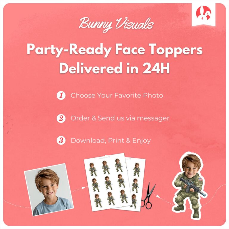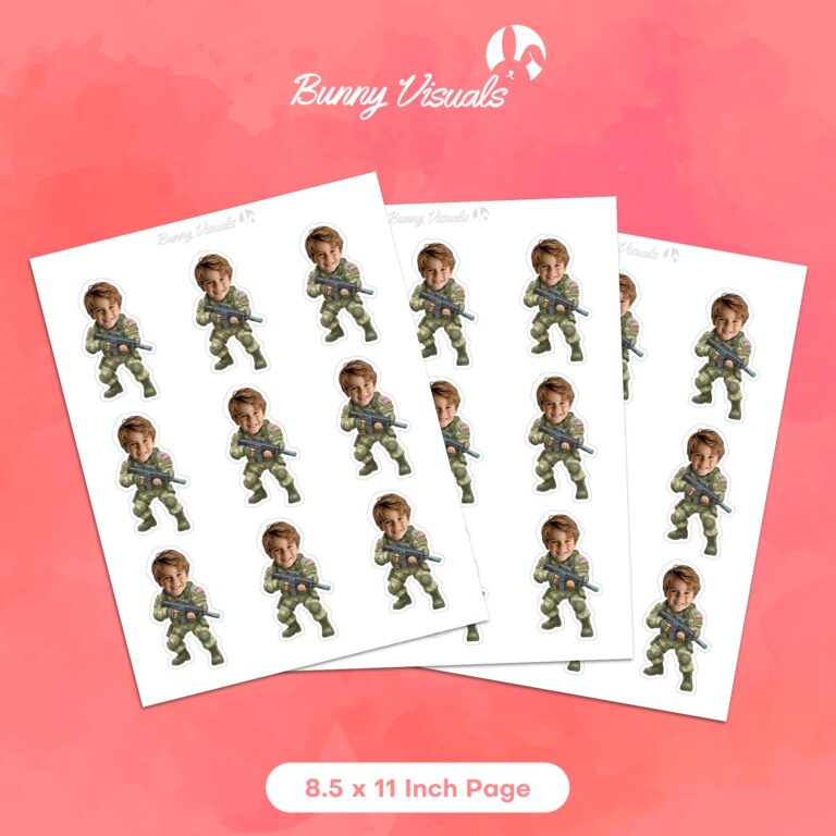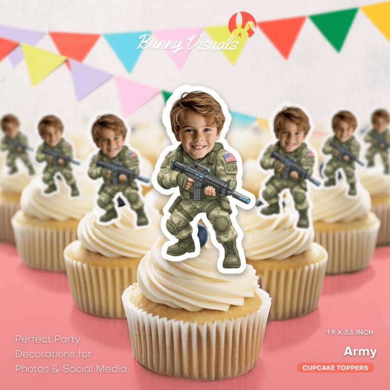 Transform your dessert table into a command center with these highly detailed custom face military toppers, designed specifically for adventurous young boys. Each topper showcases a digitally illustrated body dressed in full combat fatigues, featuring realistic camouflage patterns, protective knee pads, and a classic USA flag patch on the arm. The character is posed holding a tactical toy rifle, making it the ultimate addition to an army-themed birthday or a backyard laser tag event. Standing at approximately 3.5 inches tall, these printable decorations are sized perfectly for standard cupcakes or muffin treats. Simply provide a clear photo of your child, and their smiling face will be seamlessly integrated onto this brave soldier physique, ensuring your little recruit is the hero of the celebration. These personalized accents not only enhance the theme but also serve as memorable conversation starters for guests.