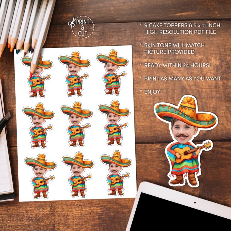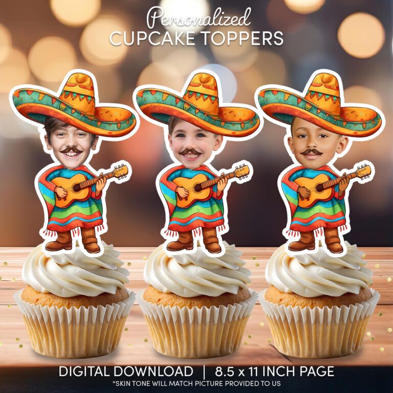 Bring the festive energy of a Mexican Fiesta to your dessert table with these hilarious and charming custom face cupcake toppers. Perfect for celebrating a special birthday or a lively Cinco de Mayo gathering, this design transforms your guest of honor into a guitar-playing mariachi musician. The illustration features a vibrant serape poncho, a large sombrero, and detailed boots, with a playful mustache added electronically to your uploaded photo for extra character. As stated on the preview, the skin tone of the cartoon body is adjusted to match the picture provided, ensuring a cohesive look. Delivered as a high-resolution digital download, these printable decorations are simple to prepare at home, turning standard cupcakes into a personalized conversation piece for guests of all ages.