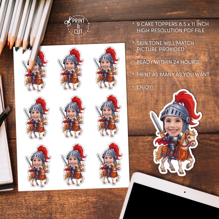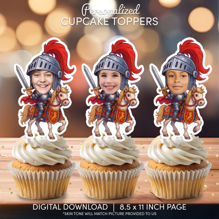 Transform your little hero into the star of the kingdom with these personalized medieval knight cupcake toppers. This digital download features a brave knight in shining armor riding a spirited white steed, complete with a vibrant red-plumed helmet and a drawn sword ready for adventure. The detailed design includes a royal lion crest on the horse’s caparison, making it an ideal choice for medieval, castle, or fairy tale-themed celebrations. Best suited for young children and toddlers, these printable decorations add a humorous and heartwarming touch to your dessert table. You simply provide a clear photo, and the face is digitally cropped to fit perfectly inside the helmet for a seamless, custom look. Once downloaded, you can print these charming designs at home on sturdy paper for high-quality party decor.