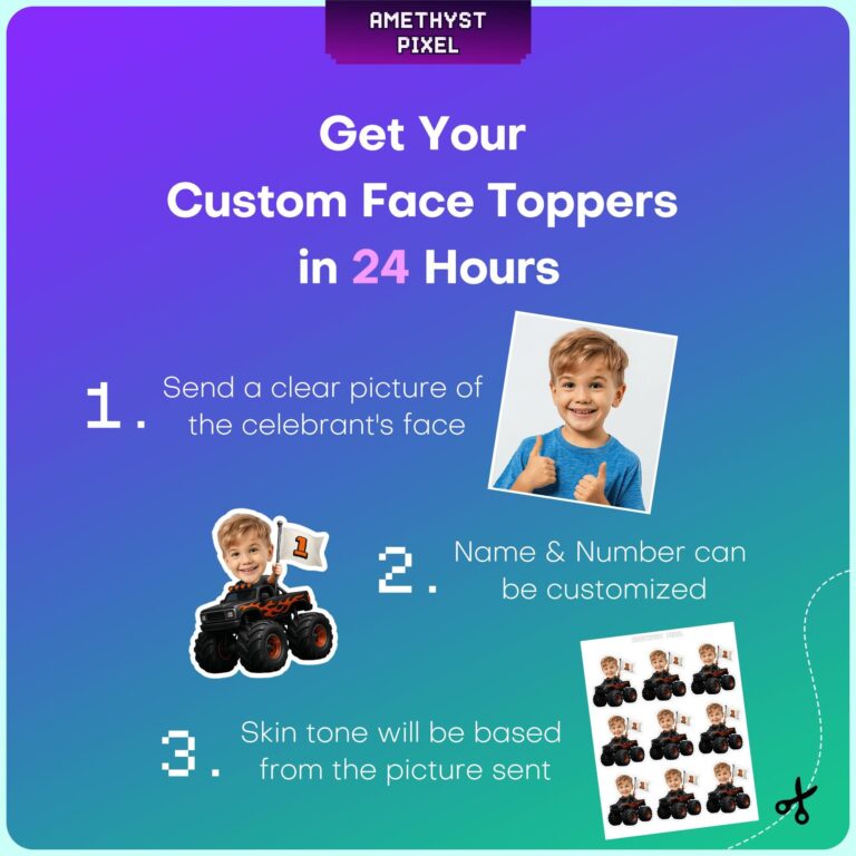 Rev up the excitement for your little racer's milestone celebration with these custom face monster truck cupcake toppers, expertly designed for a thrilling 1st birthday bash. Each high-resolution printable puts your toddler right in the driver's seat of a powerful black truck adorned with vibrant orange flames and oversized off-road tires. The charming design features your child holding a white flag prominently displaying the number “1,” creating an instant centerpiece for a “Wild One” or monster jam-themed dessert table. These personalized photo decorations serve as a high-quality, humorous addition to cupcakes, smash cakes, or savory party snacks. By integrating your baby’s photo into this rugged vehicle scene, you transform standard party treats into memorable, conversation-starting highlights that perfectly capture the energy of turning one.