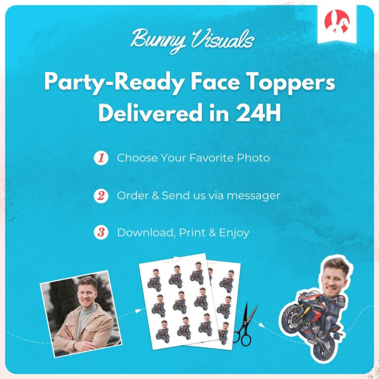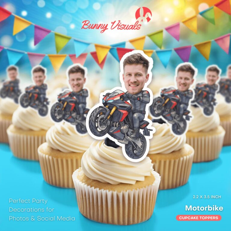 Rev up the excitement at your next event with these action-packed custom face cupcake toppers, specifically designed for the motorcycle enthusiast in your life. Expertly showcasing a high-energy illustration of a sportbike popping a wheelie, this decoration allows you to superimpose the guest of honor's face onto a rider clad in professional racing leathers. Ideal for adult birthdays, bachelor parties, or milestone celebrations for bikers, these printable decorations bring a personalized and humorous edge to your dessert display. As seasoned party decorators understand, combining a specific passion like motorcycling with high-quality photo personalization creates an unforgettable focal point that guests love sharing on social media. These toppers capture the thrill of the ride while ensuring your cake table looks professionally styled and completely unique to the birthday boy.