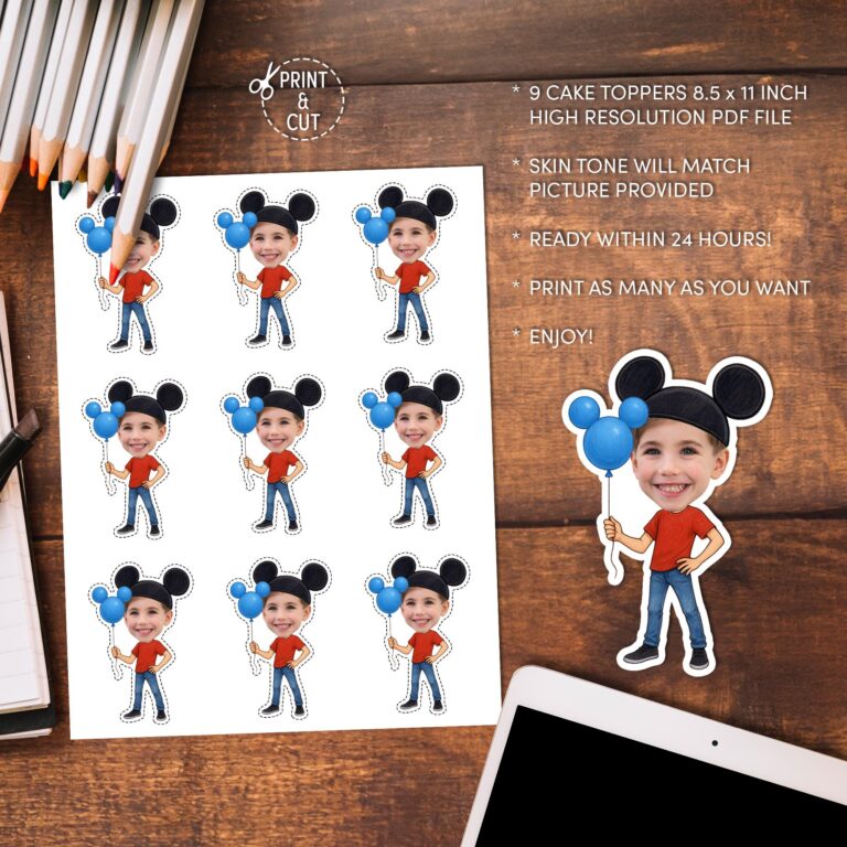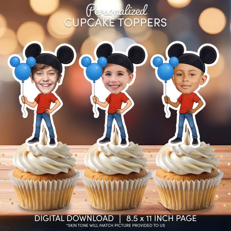Bring a touch of classic magic to your celebration with these personalized birthday cupcake toppers featuring your child’s face. Designed for a fun and iconic look, the cartoon body wears a bright red t-shirt, blue jeans, and a black hat with those unmistakable round mouse ears. The cheerful design also includes a blue mouse-shaped balloon held in one hand, making it a perfect match for clubhouse themes or theme park vacation reveals. As a digital download, this product allows you to print as many copies as you need from home. Each topper is customized by color-matching the cartoon skin tone to the photo you provide, ensuring a seamless and high-quality finish. Simply upload a clear, front-facing picture to get started on these charming DIY party decorations.