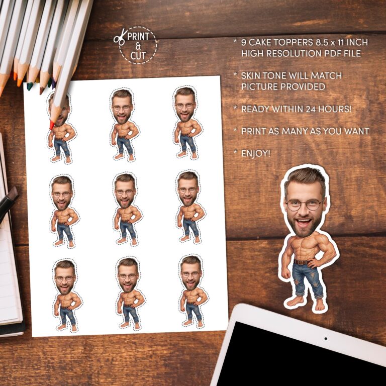 Add a hilarious and memorable touch to your bachelorette weekend or adult birthday celebration with these custom muscle man cupcake toppers. This personalized digital design features a muscular, shirtless body illustration wearing ripped jeans, customized with the face photo you provide. To ensure the best look, the skin tone of the illustrated body is adjusted to complement the uploaded picture, creating a cohesive and funny "hunk" character. Ideally suited for adult events like hen nights or milestone birthdays, these printable decorations are a simple DIY project. You will receive a high-quality digital file to print at home; just print on sturdy paper, cut around the outline, and attach to picks mainly for cupcakes or other party treats.