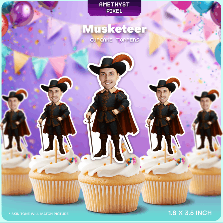 Bring a touch of Renaissance flair and swashbuckling adventure to your event with these custom Musketeer cupcake toppers. Perfect for celebrating a 'legend among men,' this digital design transforms your provided photo into a gallant swordsman complete with a feathered wide-brimmed hat, ornate doublet, cape, and rapier. While the design is sophisticated enough for adult milestone birthdays, bachelor parties, or retirement celebrations, it also works well for history-themed gatherings. You will receive a high-resolution printable file that lets you create as many toppers as needed from home. The rich colors print beautifully on white cardstock, allowing the gold embroidery details and flowing cape to pop on your dessert table.