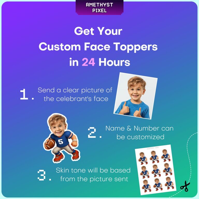 Score the ultimate touchdown at your child’s next birthday celebration with these action-packed New York football custom face cupcake toppers. Designed for energetic little sports enthusiasts, this personalized decoration features a high-quality illustration of a football player in a classic blue jersey, grey pants, and distinctive red cleats, sprinting towards the end zone while clutching the ball. By incorporating your child’s photo onto the character, you create a hilarious and memorable centerpiece for your dessert table that highlights their love for the game. Measuring approximately 3.3 inches in height, these toppers are perfectly scaled to stand out on standard cupcakes or frosted muffins without toppling over. Whether you are hosting a big game watch party or a dedicated sports-themed birthday bash, these toppers add professional flair and personalized fun, ensuring your little quarterback feels like the MVP of the day.