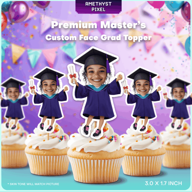 Celebrate a major academic milestone with these personalized Master's degree graduation cupcake toppers. Featuring a festive illustration of a graduate in a purple gown and mortarboard cap holding a rolled diploma, this design is perfect for adding a fun, custom touch to any graduation party. The digital template allows you to insert the graduate's photo, creating a humorous and memorable "mini-me" decoration that works wonderfully for adults earning advanced degrees or even for younger graduates with purple school colors. Designed for high-resolution printing at home, the file renders sharp colors and clear photo details. Simply print, cut around the included white border, and assemble for a unique addition to your dessert table.