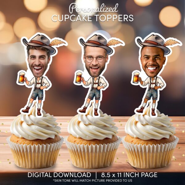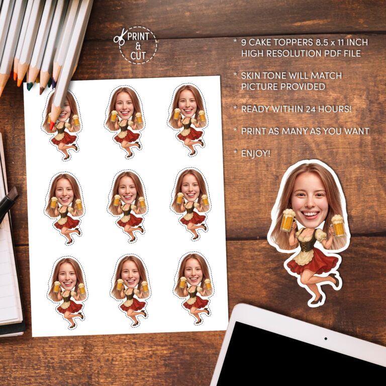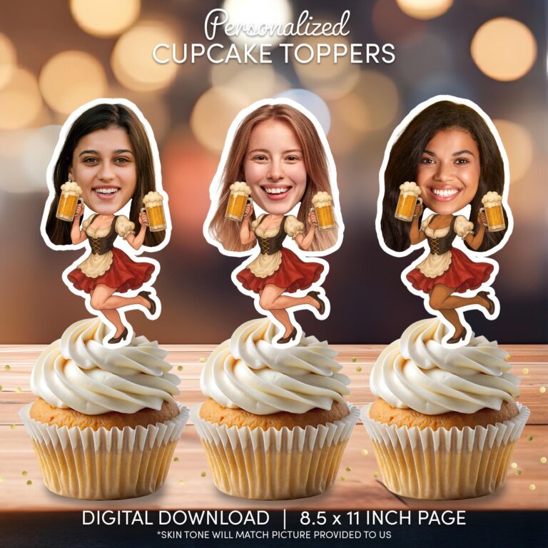 Get the party started with these hilarious and festive custom face cupcake toppers, perfect for Oktoberfest celebrations or beer-loving birthday events. This digital download features a lively Bavarian beer maid design, complete with a traditional red dirndl and two frothy beer steins, ready to be personalized with the guest of honor's face. As part of our expert design service, we carefully crop your photo and adjust the illustration's skin tone to match the picture provided, ensuring a cohesive and professional look. These printable decorations are best suited for adult birthday parties, bachelorette weekends, or brewery events. Once you receive your file, you can easily print them at home to create unique dessert table accents that are sure to get a laugh.