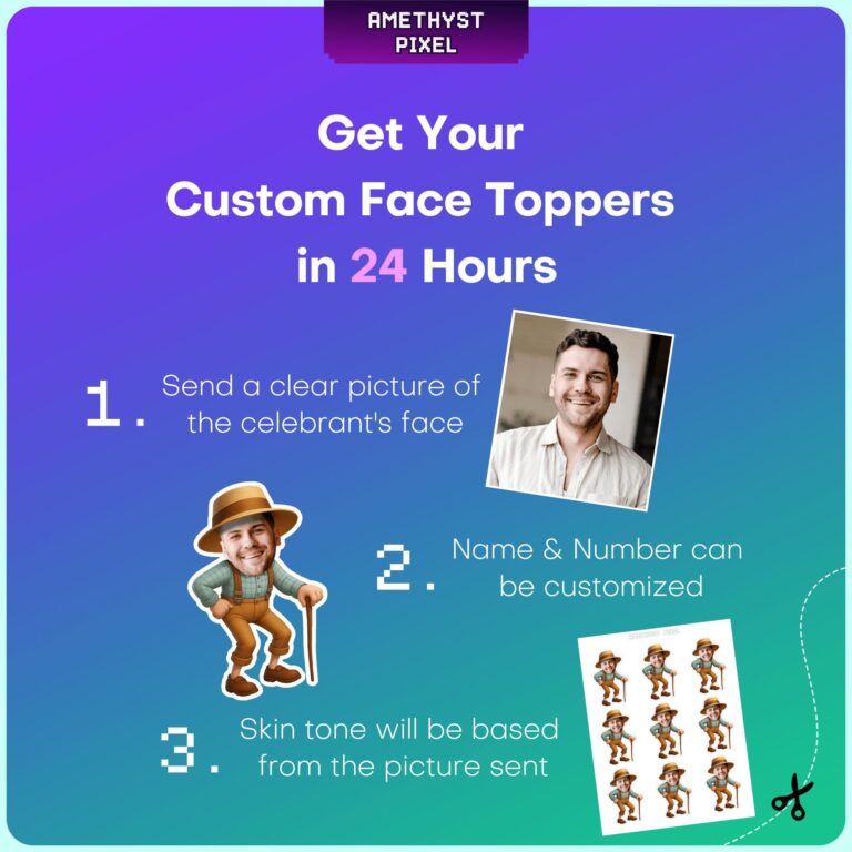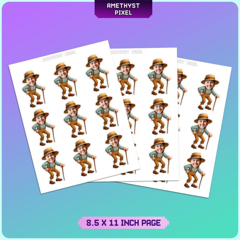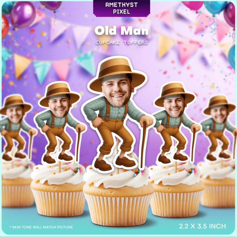 Inject a dose of humor into your next milestone celebration with these hilarious custom face old man cupcake toppers. Specifically designed for "Over the Hill" parties, retirements, or significant birthdays like the 40th or 50th, this design features a charming elderly caricature complete with a wide-brimmed hat, green plaid shirt, brown suspenders, and a walking cane. By placing the guest of honor's photo on this stooped, cane-wielding body, you create an instant conversation starter that playfully teases them about aging. These high-resolution printable files are optimized for easy DIY assembly, ensuring your dessert table features crisp, vibrant decorations that celebrate the golden years with a wink and a smile.
